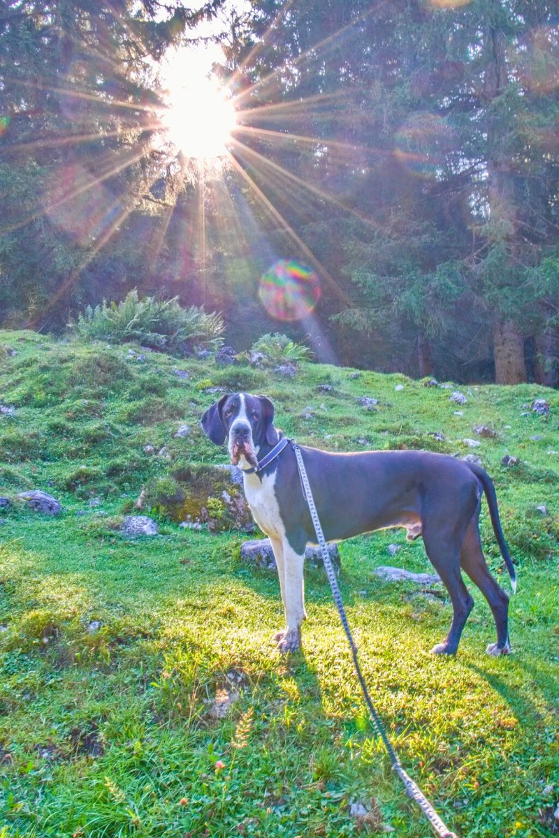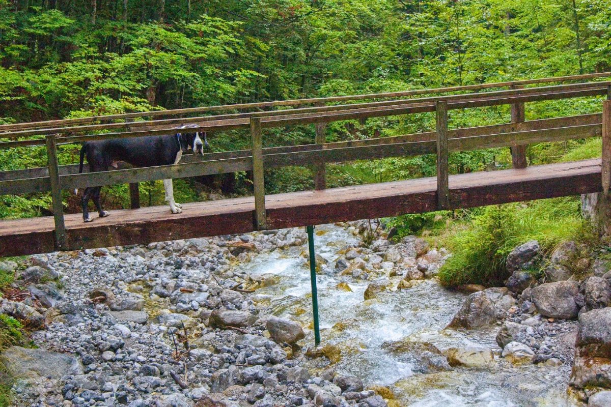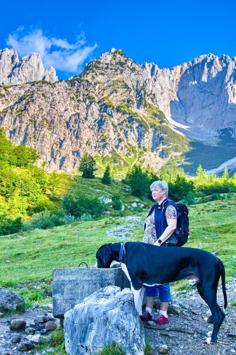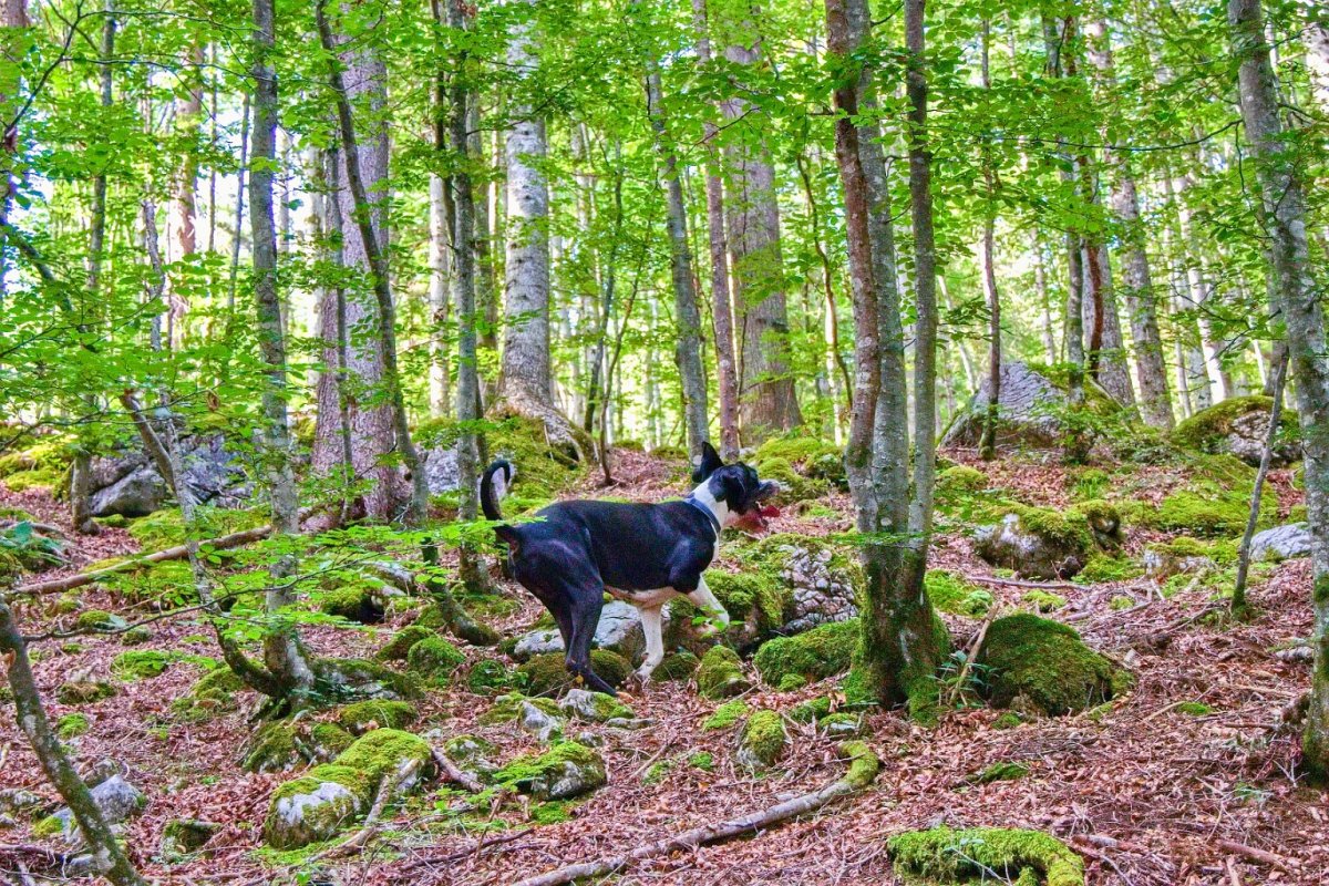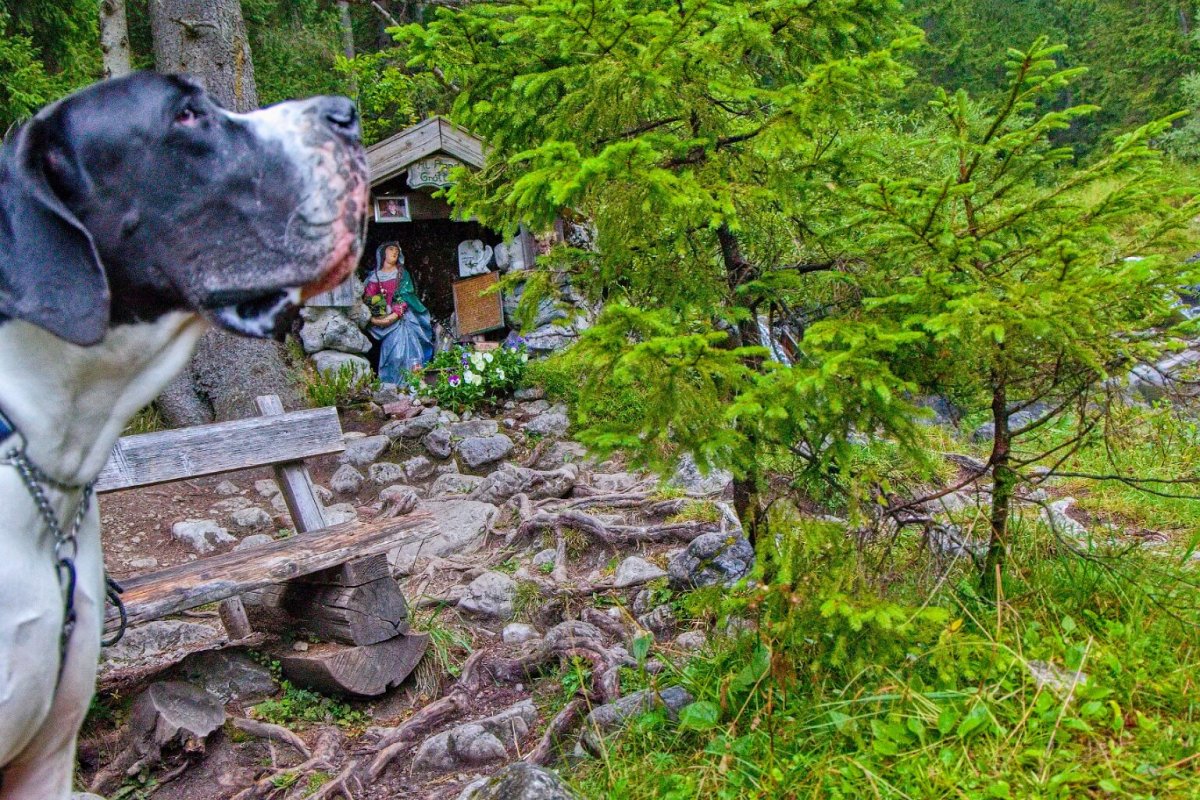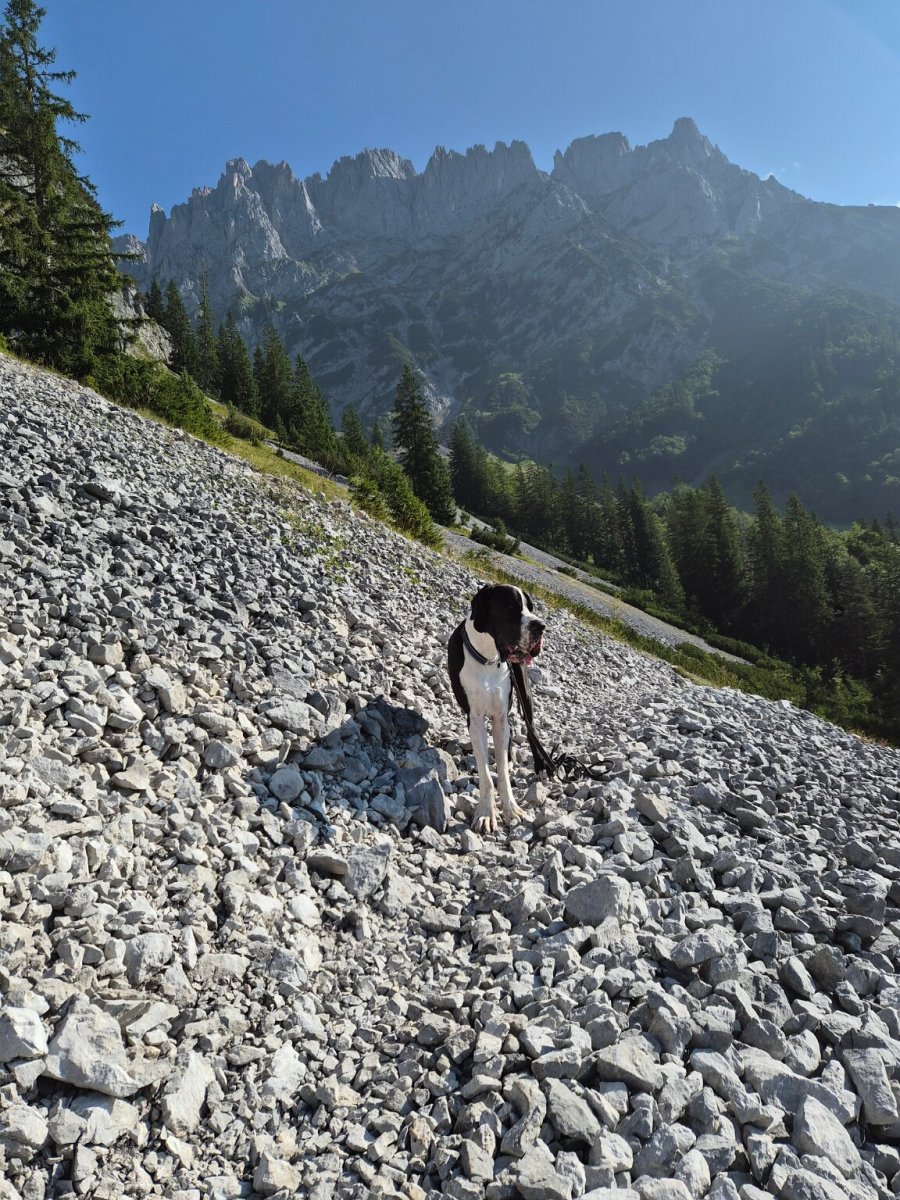 Yoda perfektně zvládal krávy - i průchod mezi dvěma (to když se každá pásla na jedné straně cesty), jen jedna černá (byla i jiné stavby těla a byla jako jedna z mála rohatá) se mu nelíbila a on se nelíbil jí ("vrčela" na nás 😲 a byla schopná ho jít provokovat k ohradníku těsně u chalupy - a to měly krávy k dispozici obrovské prostory). Krav tam bylo mraky a vyhnout se jim nedalo. Koníci a kamzíci byli vzácnější. Yoda v horách osvědčil, že je kamzík jizerskohorský - nevadila mu ani suťová pole, využíval cestou napáječky pro dobytky (a já mu vláčela pro jistotu vodu).