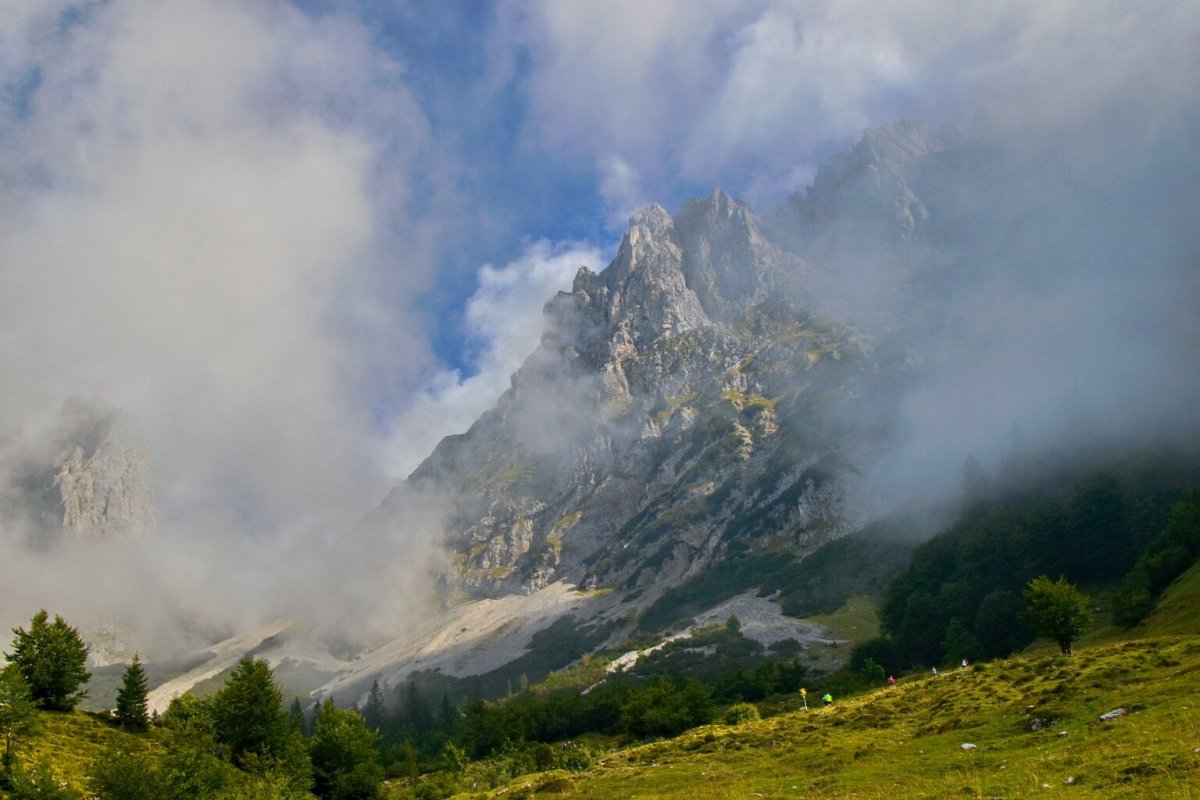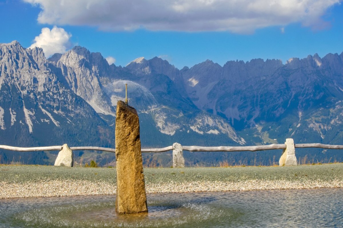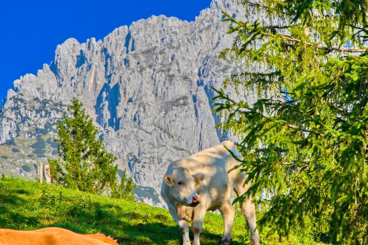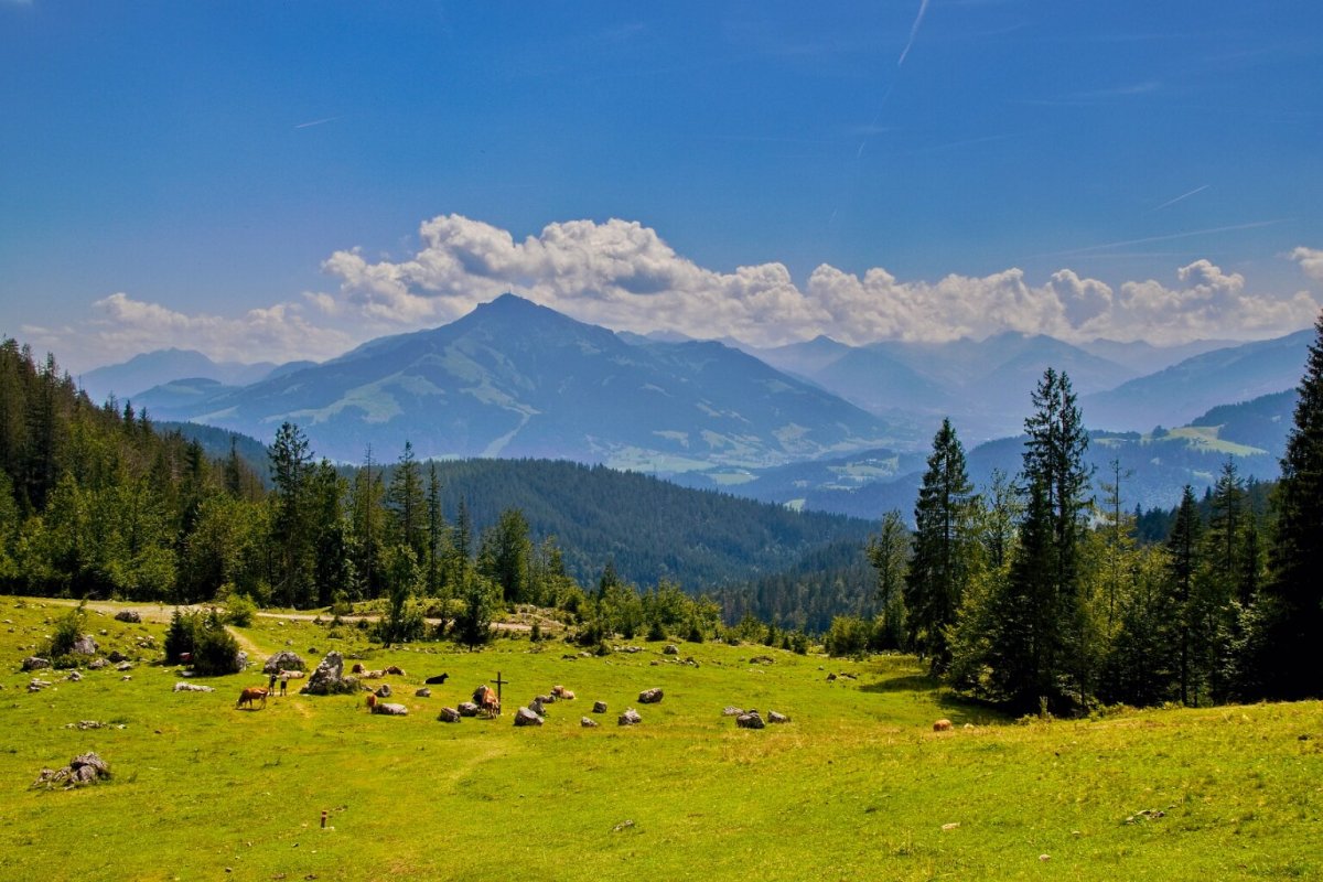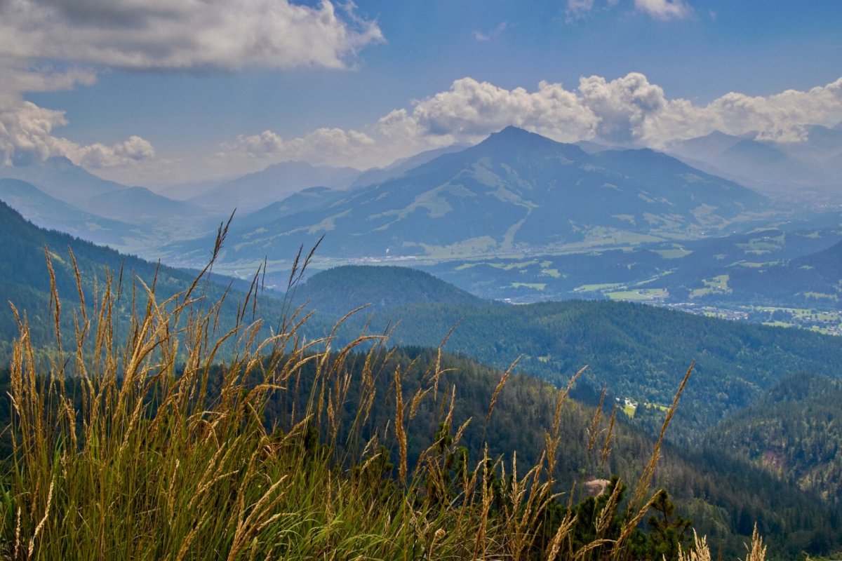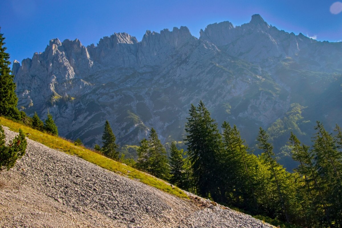 je to v Tyrolsku - kousek od Kufsteinu. Ten masiv je Divoký císař (Wilden Kaiser), z druhé strany údolí je Hartkaiser… prostě někdy tomu říkají Císařské Alpy. Bydleli jsme nad Ellmau - domky patřily k Wochenbruner Alm.