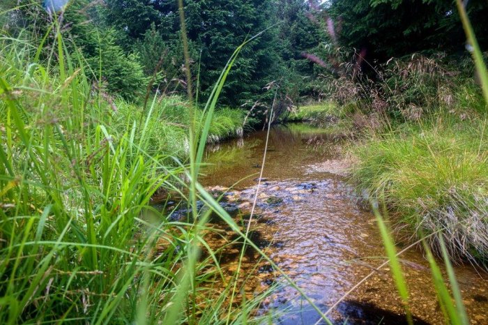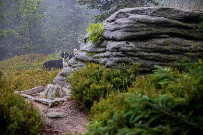 Parkovali jsme pod Bukovcem na Mořině - šli kus po Promenádní a kus po Jezdecké cestě, a pak jsme se vydali po stezníčku na Černý vrch. To nejsou trasy, které bych někomu radila - vždy říkám, že jsou jen pro ty, kteří znají hory jak své boty, prošli hory po cestách značených i neznačených za každého počasí - a mají je moc rádi. Psa tam mám vždy na vodítku, nelezu tam v době hnízdění tetřívků… Pak jsme klesli stezníkem do údolí Jizerky, přebrodili jí a vydali se do protistráně směr Pytlácké kameny. Na JIzerku jsme šli kus po značce (přes Jelení stráň), kus zase cestičkami neznačenými a do JIzerky došli po staré Celní cestě. Asi 17 kiláků, převýšení nic moc - ani 400 metrů to nebylo. Mokří jsme byli do pasu (chodníčky lemovala podzimní tráva úplně mokrá po nočním dešti), občas jsme zajeli nohou do podmáčených mechovišť až nad kotníky (to se pak brodí bez zbytečného sundávání bot, neb vlhkost v nich je stejně 1000%)