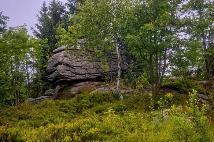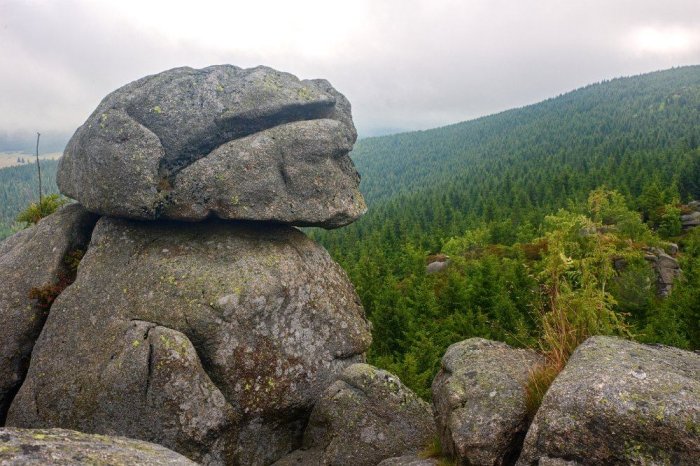 a nakonec včerejší delší Jizerky (hory) - ráno bylo mlžno, krásně voda čvachtala pod nohama (vylezli jsme na vrchol Černého vrchu a tam vede jen podmáčený stezníček), přebradili jsme malou Jizerku (říčku) a vylezli na Pytlácké kameny. Místní skála Mozek byla ukázána Yodovi, že by ho taky někdy potřeboval…To již sluníčko občas vykouklo a když jsme se vraceli přes Jizerku (osadu), tak už sluníčko svítilo a lidí tam bylo víc, než na Václaváku…