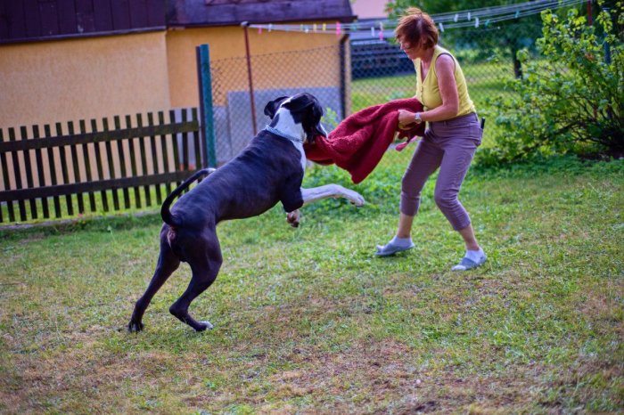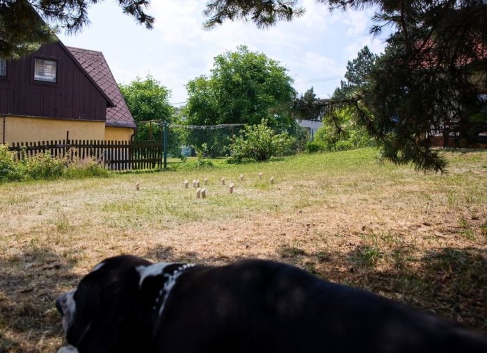 a teď ty psí - měl pochopitelně jinou psovodku (vnučka si to nedá sebrat), u finských kuželek byl překvapivě hodný (to mě překvapilo, špalky jinak miluje), jinak si řádění užíval - ať při honění s dětmi a nebo boji o deku se švagrovou (prý byl při střelbě hodný a tak bude stará deka jeho)