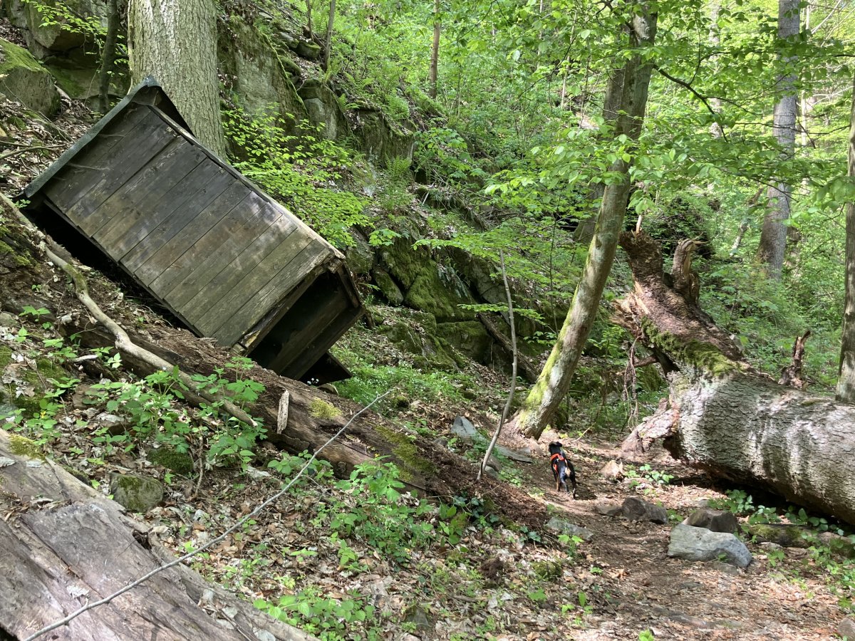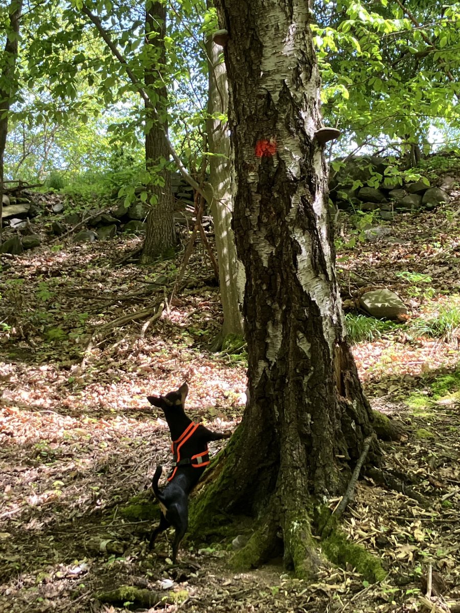 Dneska jsme šly na jih, chodíme tam kvůli kůrovci málo. Potkaly jsme pesana, který neotravoval, nevšímal si, značka ideál. Tak jsme se na pár kilometrů přidaly. Všimněte si fotky, kde se Bonnie plazí a maskuje se za dobrmana s kupýrovanýma ušima. Určitě chtěla vypadat na fotce drsně 😂