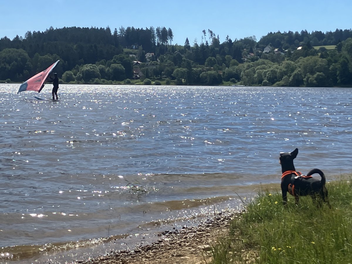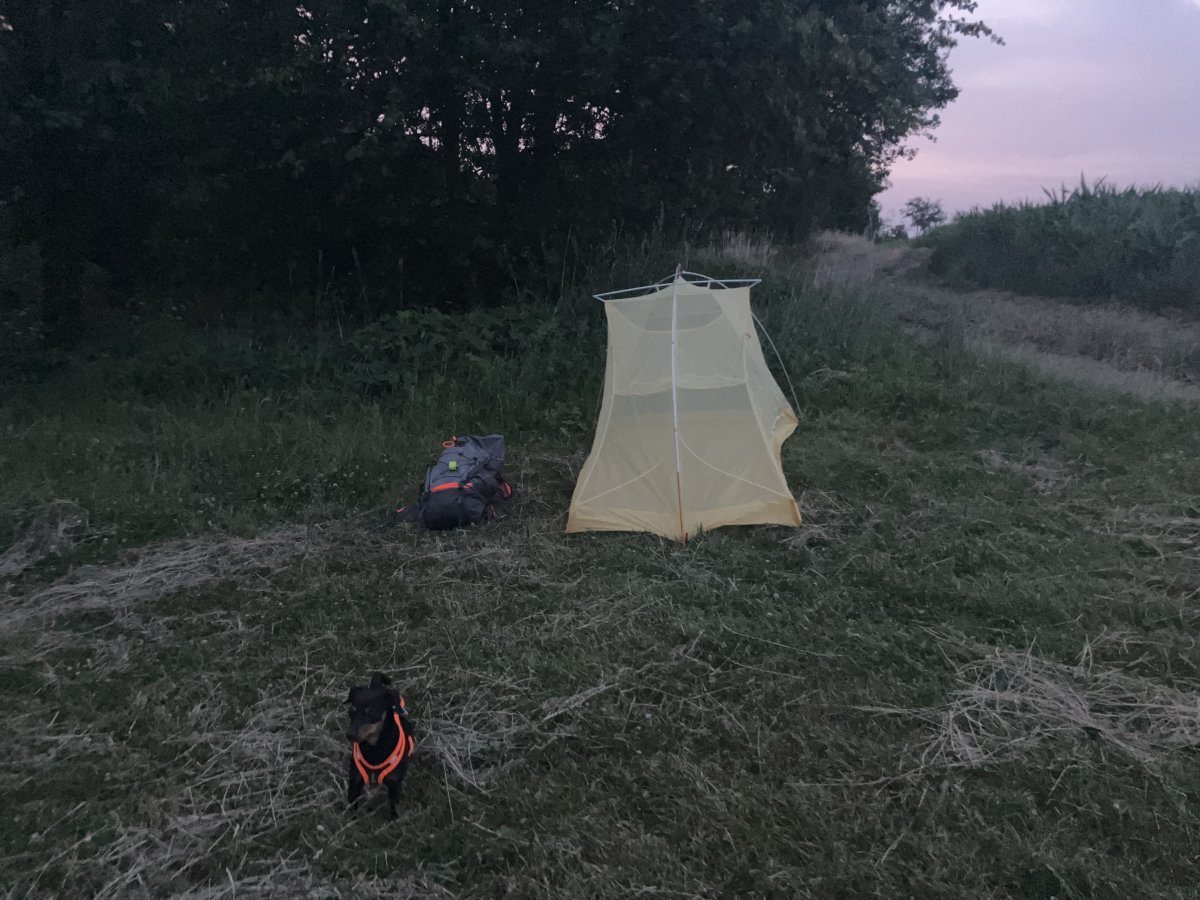 Takže dopoledne náhradní program. Účastnili jsme se s Bonnie a dalšími čtyřmi psy z našeho cvičáku ukázky výcviku psů na charitativní akci. U super rybníku s pozvolným pískovým vstupem. A protože bydlím v podkroví, kde je strašně, utekla jsem večer přespat kousek od Chrudimky. Tentokrát jsem nevzala hamaku, ale zkouším jen vnitřní stan (moskytiéru). Snad neuletíme, fouká tu cca 25, 30 km/hod. Minimálně. Tak je ta teplota v kombinaci s větrem velmi příjemná.