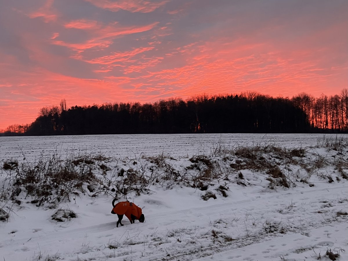Dopoledne cca -1, -2 stupně. Bonnie vyběhla v podzimním oblečku (koupeném nedávno, nový model Non-stop, chlupatinou podšitá pláštěnka, perfektní věc pro raptora na chladný podzim). Po asi 5 minutách jejího běhu (a mého klusu) jsem obleček sundala. A bylo jí ve cvalu fajn. Daly jsme 5 km.