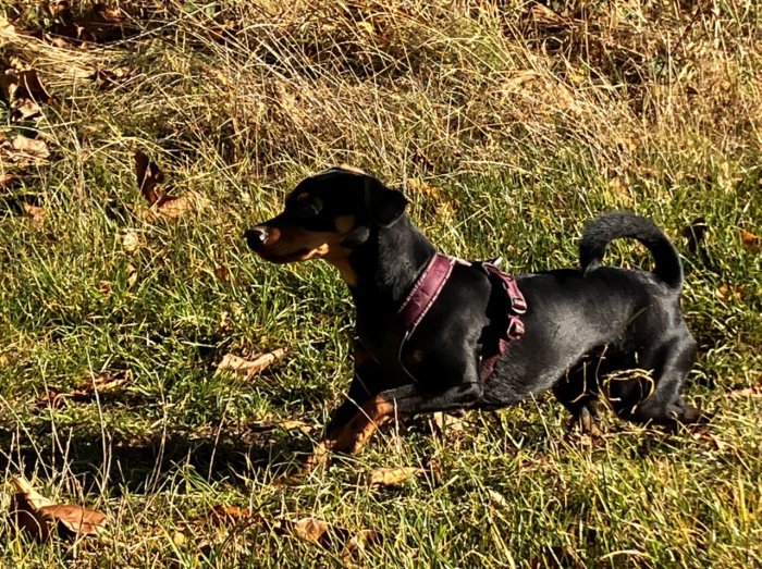 I když ne všichni pinčové štěkají, moje to umí dokonale a hned od prvního štěněčího dne u mě. A venku štěká s oblibou na vše, co se jí nezdá. Pokud je nevyřáděná, štěká o to víc - na začátku procházek v tom případě utíká a štěká jen tak z radosti ze štěkání (když si nenajde důvod v podobě “ten člověk je podezřelý”). A během první půlhodiny to klidně zopakuje, běží a štěká, štěká a běží.