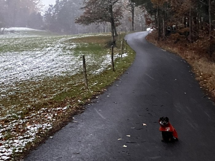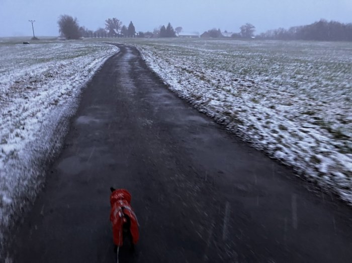 Na mokrý sníh Bonnie říká ne. Pro jistotu jsem vyzkoušela všechny zimní oblečky. A že jsem jich nakoupila…. Poslední tři dny venčím jen po vesnici, na milost bere milostpaní i statek. Ale procházka? Ani náhodou. Ale teď už přituhuje a zdá se, že namrzlý sníh bude pro ratloraptora lepší.
