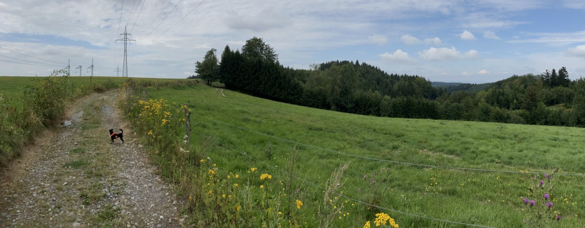 První fotka - konec vesnice a koňská letní pastvina. Sluníčko vydrželo jen 10 minut. Poslední fotky jsou z té stejné pastviny. A rozdíl mezi druhou a třetí fotkou je asi 100 metrů při stejné nadmořské výšce.