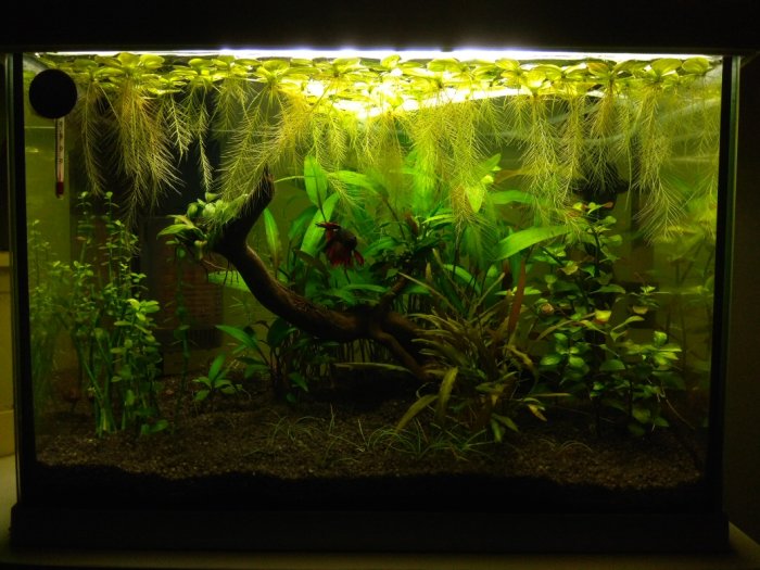 Přikládám foto svého starého bettária: 35x25x25 cm (necelých 22 l). Vlevo vzadu je filtr, vpravo vzadu vykukuje topítko. Nahoře to má plastový kryt se zářivkou. Taková nádržka se všude vejde, udrží ji kdejaká skříňka a i celkem hezky vypadá. Vnitřní filtr je tak tichý, že o něm člověk ani neví a akvárko může být klidně v místnosti, kde se spí. Zářivku zapíná a vypíná časovač do zásuvky. Tak jednou do měsíce je potřeba lehce odkalit dno a vyměnit u toho část vody. A nepřekrmovat, to je třeba děti pohlídat - taky se od toho kazí voda.