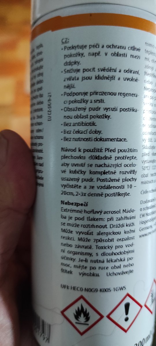 kocour měl totéž, naštěstí mu vetka nekrotizovanou tkáň odstranila hned (ona se ta kůže v podstatě rozpadla), kolco v průměru cca 6 cm, hojení bez krytí (nedalo by se realizovat), oplachy betadinou + hemagel (asi) a žádný strup se nekonal