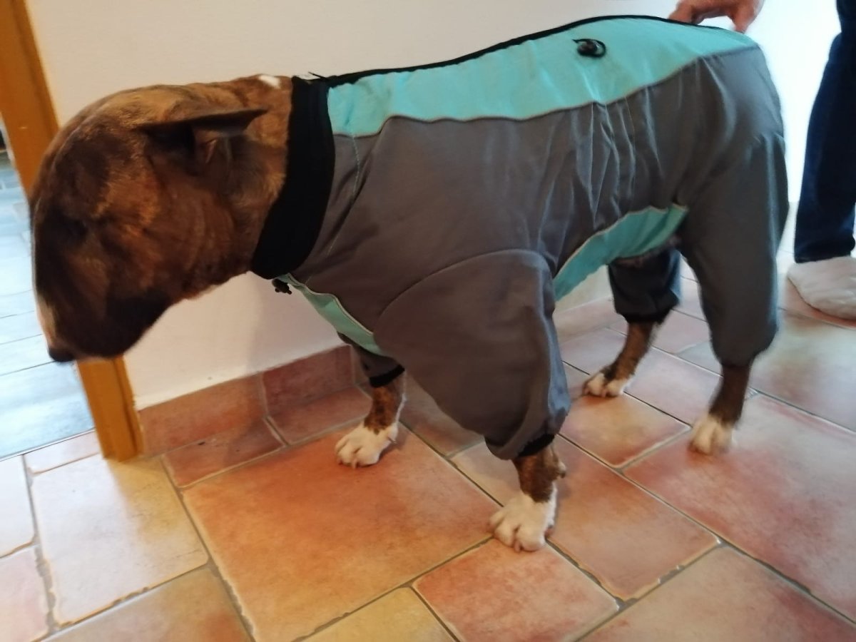 To byl první pokus, byla v tom našťouchnutá jako potapěč v neoprenu-je jí to úzké velikost : overal mentol 50cm, ještě jí mám, kdo by chtěl, velikost asi na kokra…chtěla jsem s nohavičkama, aby jí nenamrzalo železo v noze…