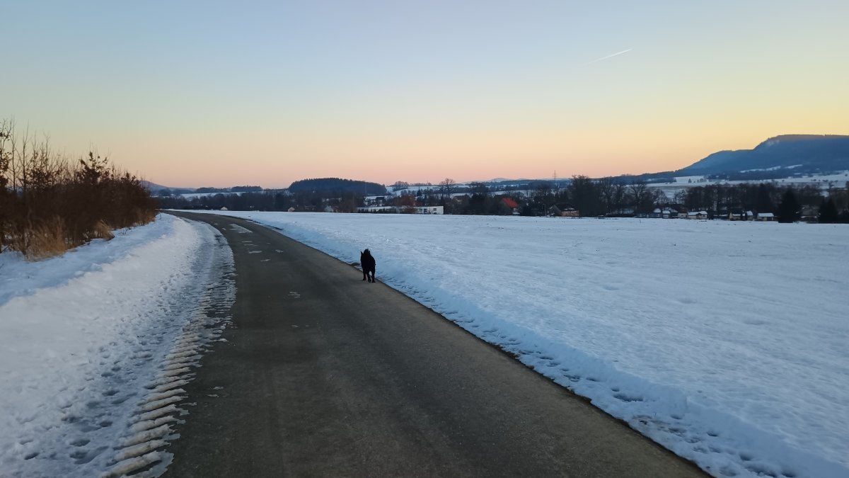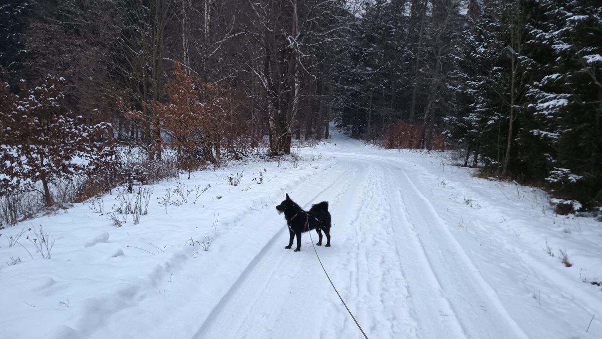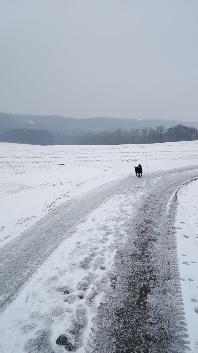 My teda venčení letos naprd. Jsme doma furt nějak marodný. Když ne já, tak dcera, takže až večer přijde muž, tak se jde ven. Dneska jsem šla já. Malina mě vzala po cyklostezce do vedlejší vesnice, pěkně se nám šlo až do okamžiku, kdy se začala pořád otáčet, což bylo jasný, že vidí něco víc než jednoho člověka. Tak jsem se nakonec otočila taky a viděla chlapa jak ho vleče za námi obrovský pes, podle svítícího obojku něco jak rotvajler nebo xl bully. Prostě obluda se širokymi plecemi a dost to vypadalo, že tomu šéfuje. Tak jsem nasadila rychlochůzi, což Malina viditelně přijala s povděkem, taky netoužila, aby nás došli. Metla jsem i s rozvázanou botou, abychom je setřásli a podle Maliny jsem viděla, že jdou furt za námi. No když jsme vyšli z vesnice na cyklostezku a podívala jsem se za sebe, tak je vidím, že budou pokračovat jako jiným směrem, ale pak jakoby si to rozmysleli a šli zase za námi a to jsem teda usoudila, že není čas na hrdinství, mezi polema je potkat nechci a dala jsem se doběhu, Malina teda neváhala a šla do toho se mnou a pořád koukala, jak moc to s tím během myslím vážně. Přece jen se známe už nějaký ten pátek a tohle ještě neviděla, že umím popoběhnout pár metrů, to ví, ale kilometr? No ale setřásli jsme je. Asi o nic nešlo, mě se jenom nelíbilo, že se za námi nějak moc ženou a pak ta viditelná změna směru…Fotky z venčení jsou 14 dní starý. Sníh už u nás moc není.