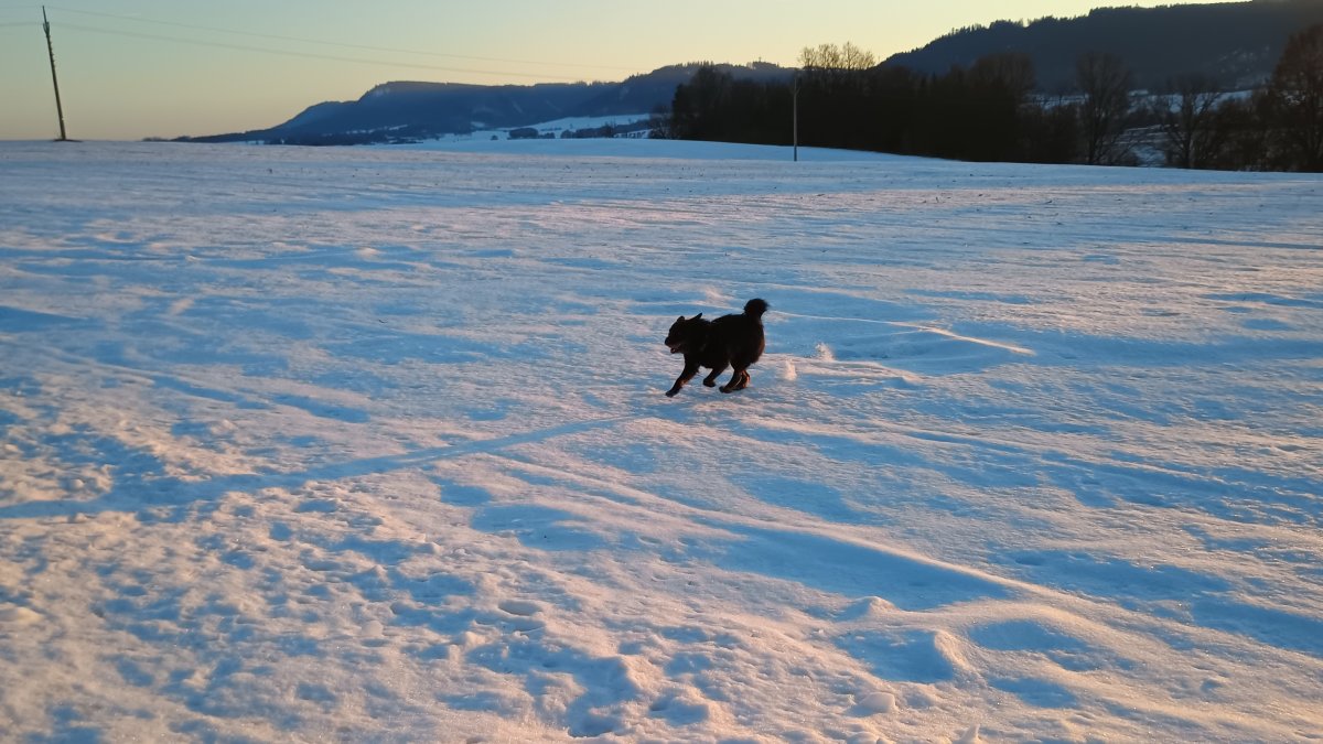 Tak my s Malinou taky vyrazily. Šlo se celkem pěkně, chumelilo. Klouzalo to jen málokde. Když jsme už byly zpět ve vsi, narazily jsme na odrostlé tele a fakt mě rozesmál. Nejdřív na nás koukalo, pak letělo k plotu, že si nás prohlédne, Malina se za mě schovala a vrčela na něj. Pak nás doprovázel podle plotu a tak srandovně hopkal. Malina se celkem bála a byla ochotná mě použít jako štít 😄.