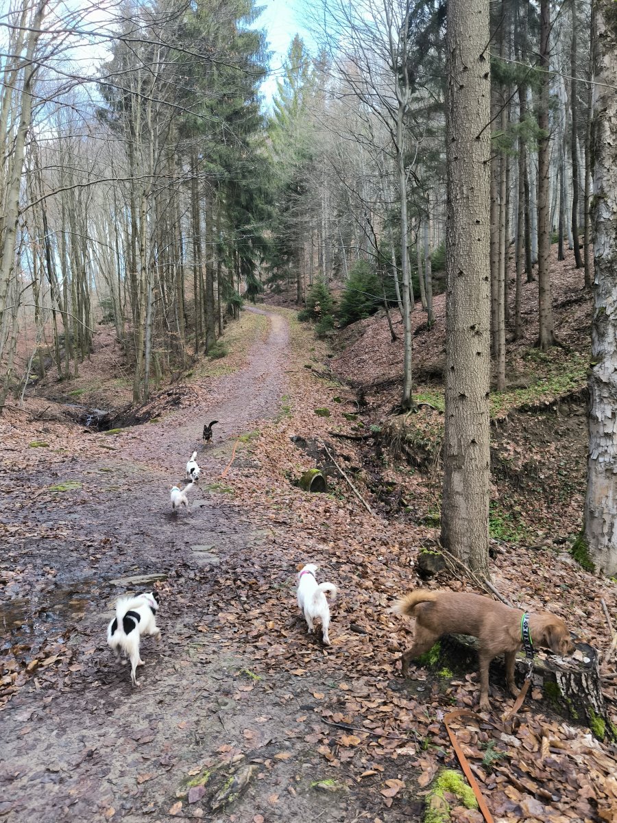 Dneska se u nás nevenčilo, pršelo, ale včera jsme šly asi 18 km, tak jsme si to nadpracovaly. Byly jsme na Lázku (Záhřebská vrchovina), Cukrová bouda.. Na Cukrové boudě by se měli vyskytovat vlci. My je neviděly, ale Malina něco cítila a viděla a pořád zastavovala a pozorovala les, srnka to nebyla, to by měla tendecní “jít tím směrem”. Narazily jsme na trusy v podstatě vyřadované na cestě, možná od psa , ale spíš od těch vlků, Malina to očuchala a zase zírala do lesa. Kámoška mi tvrdila, že se v té oblasti pohybuje 14 děsně agresivních vlků , čemuž moc nevěřím, ale místní myslivec, co je má přímo v rajónu, tak na točil na fotopast vlky tři a sám je teda neviděl fyzicky vůbec. Kámoška totiž kvůli tomu odmítla se mnou do lesa na procházku. Tak jsme holt šly samy a za celou cestu jsme nepotkaly nejen vlka, ale ani žádné lidi, bylo to super.