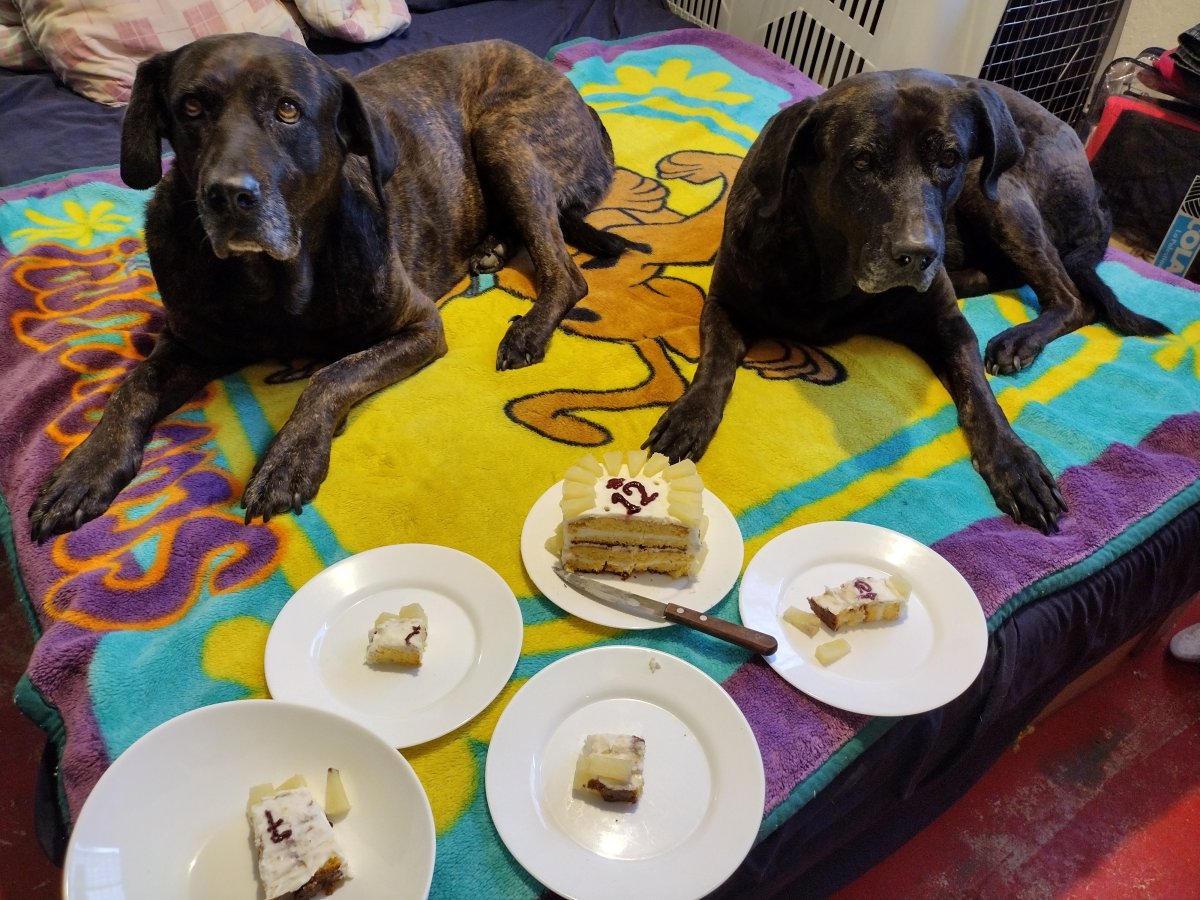 Na narozeniny jim dělám dort. Všichni moji psi jsou docela buchtový, a potěší je, že jedí s náma. Letos to dvojčata mrkvanec, naštěstí na ledvinovou dietu ideální poměry surovin, jen jsem dala míň žloutků.