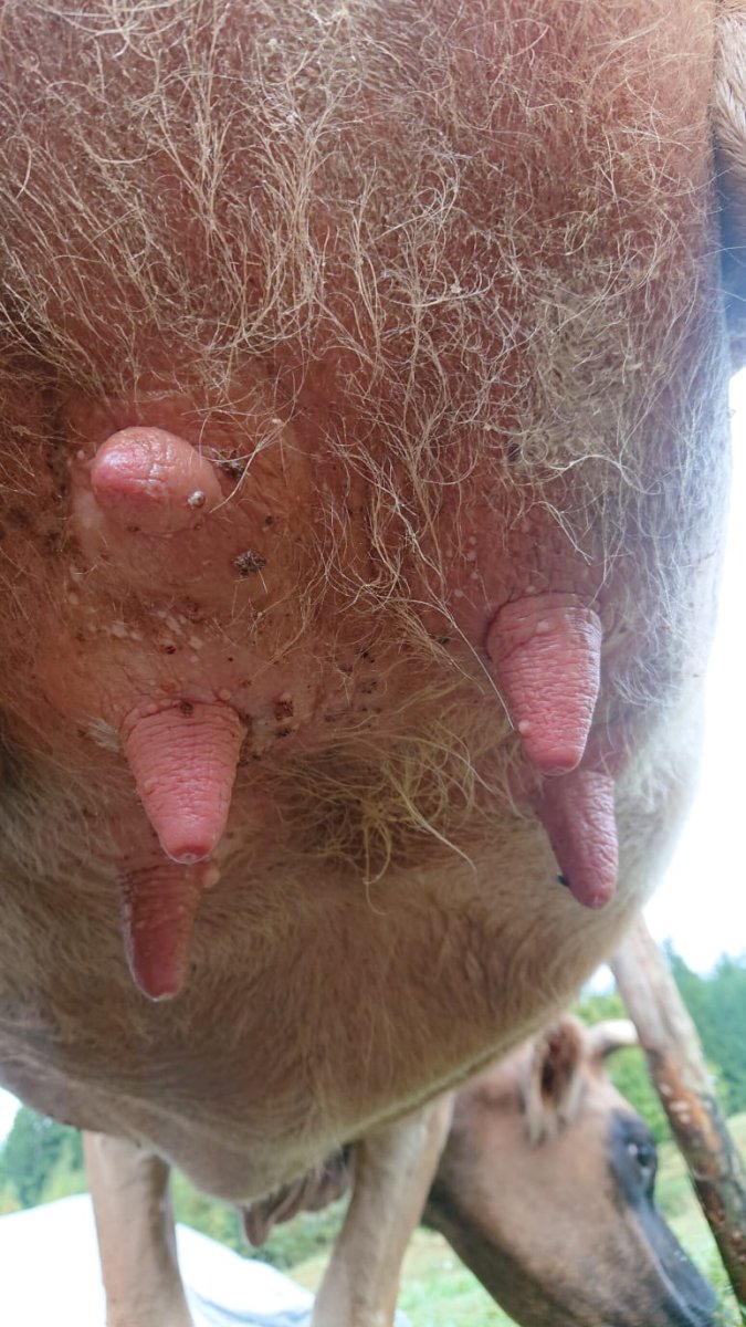 Dostala 10ml parovetu (oxitocin) a ještě Ketosol 100, což by mělo být proti té mastitide. Po oxytocinu olízala Cyrila kompletně, ale nerozdojila se. Vymackala jsem možná tak ještě dalších 100, možná 200ml. Víc určitě ne 😟 Veminko má opravdu opravdu plné, mliko co z ní teče je normálně tekutý, žádné hrudky, nazloutly (řekla bych zlutsi než od druhé krávy, trochu jako takový starší mlezivo). Problém je, že se prostě nedoplňuje z vemena do těch ceciku, vždycky vykapne trošičku a pak nic, takže zkouším ty ostatní a pak zase vykapne kapička… ani se ten cecik nenaplni
