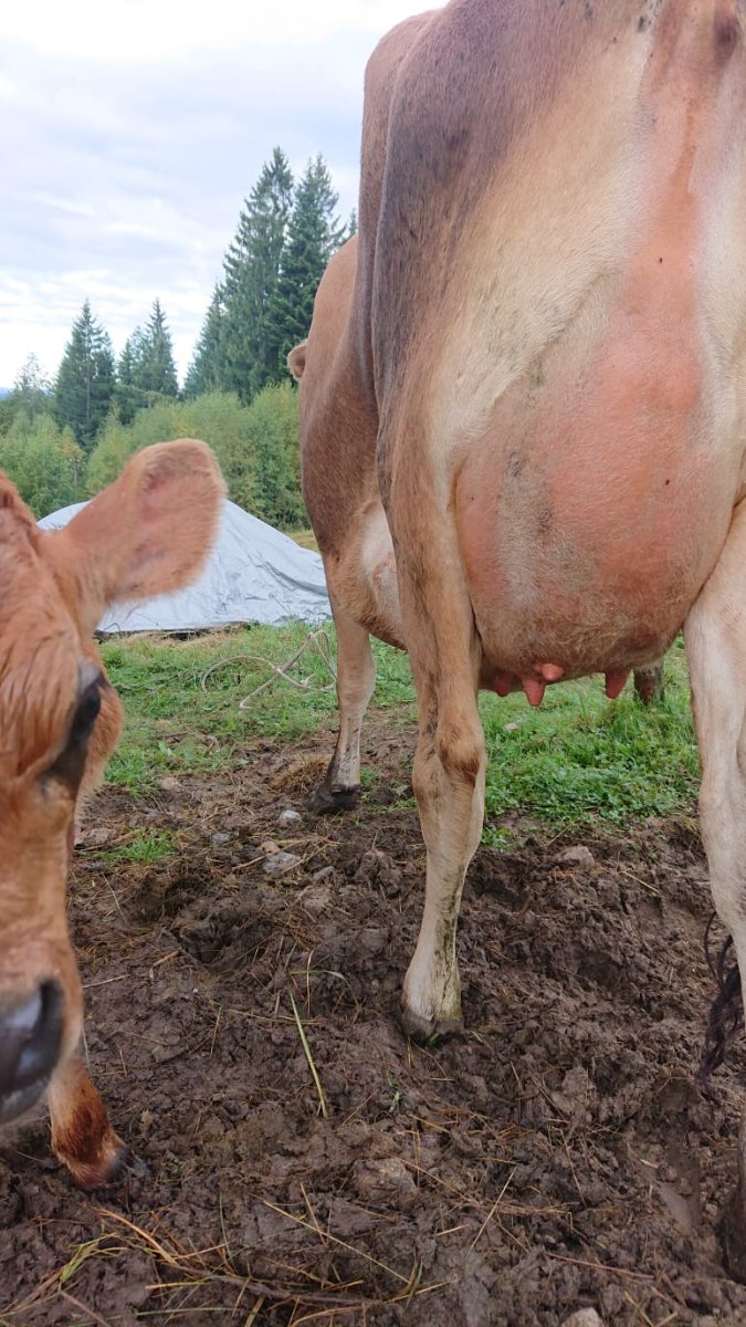 Kráva žere, Cyrilovi už mléko nějak pustí, ale vemeno má tak natekle, že se jí blbě chodí. Masirujeme ji ho několikrát denně, vidíme, že Cyril pije, ale my nedojime. Jinak čekáme co to udělá. Včera vet slíbil, že to ještě probere s nějakými dalšími veterináři. Posílal jim fotky, tak uvidíme.