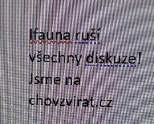 S paní Šárkou jsem si dnes chvíli dopisoval. V podstatě mi vysvětlila její postoj a omluvila se, že musela mazat příspěvky odkazující na chovzvířat.cz. Ani ona není z konce diskuze nadšená, sama by to nikdy nedopustila. Osobně vidím největší problém ve starém vedení iFauny. Prvně si měli proklepnout zájemce a zjistit co se s webem plánuje, ne jenom shrábnout nemalé peníze.