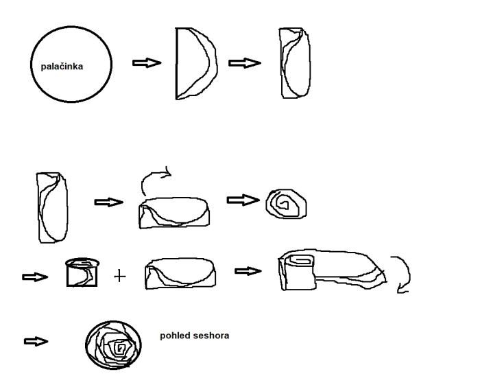 To jsme na nějakém vařícím kanále na youtube objevily se známou, tenhle recepis. To se udělají čokoládové palačinky, krém, palačinky se namažou, přehnou na půl, znovu namažou, přehnou na čtvrtku, z jedné strany znovu namažou a skládají se takhle ohnuté na stojáka - první s druhou se zatočí do ruličky, rulička se postaví na tác, a ostatní se připlácávají zboku. Na závěr se to pomaže svrchu a kdyby mi zbylo patlámo, tak i zboku tím krémem. A strčí do lednice - nepečený.