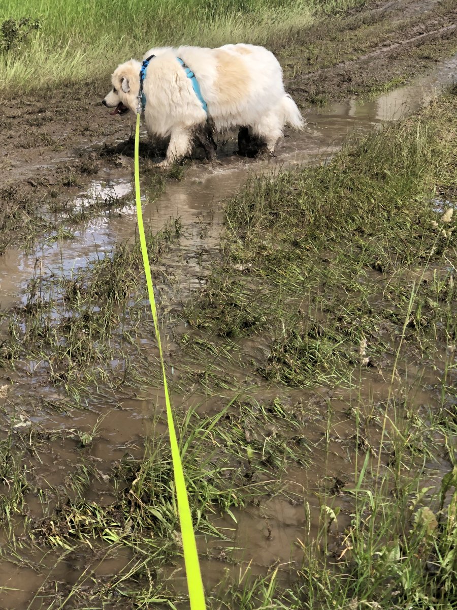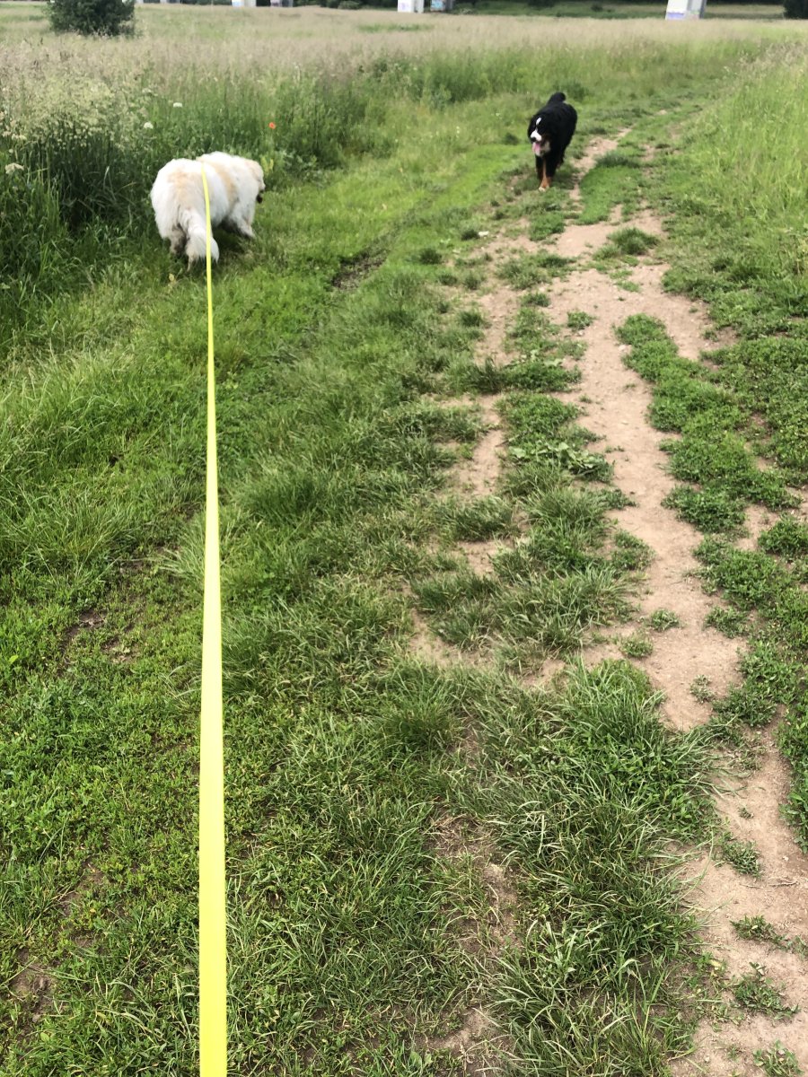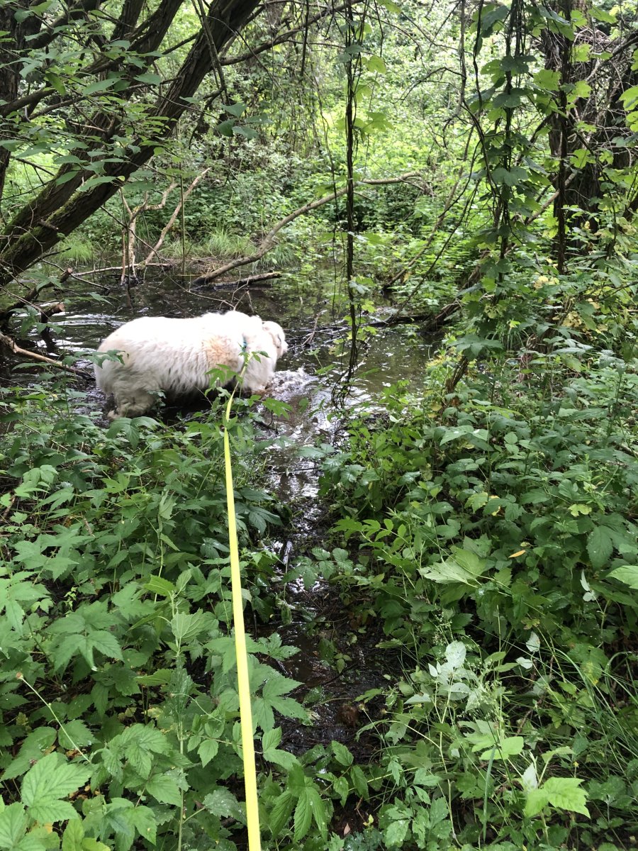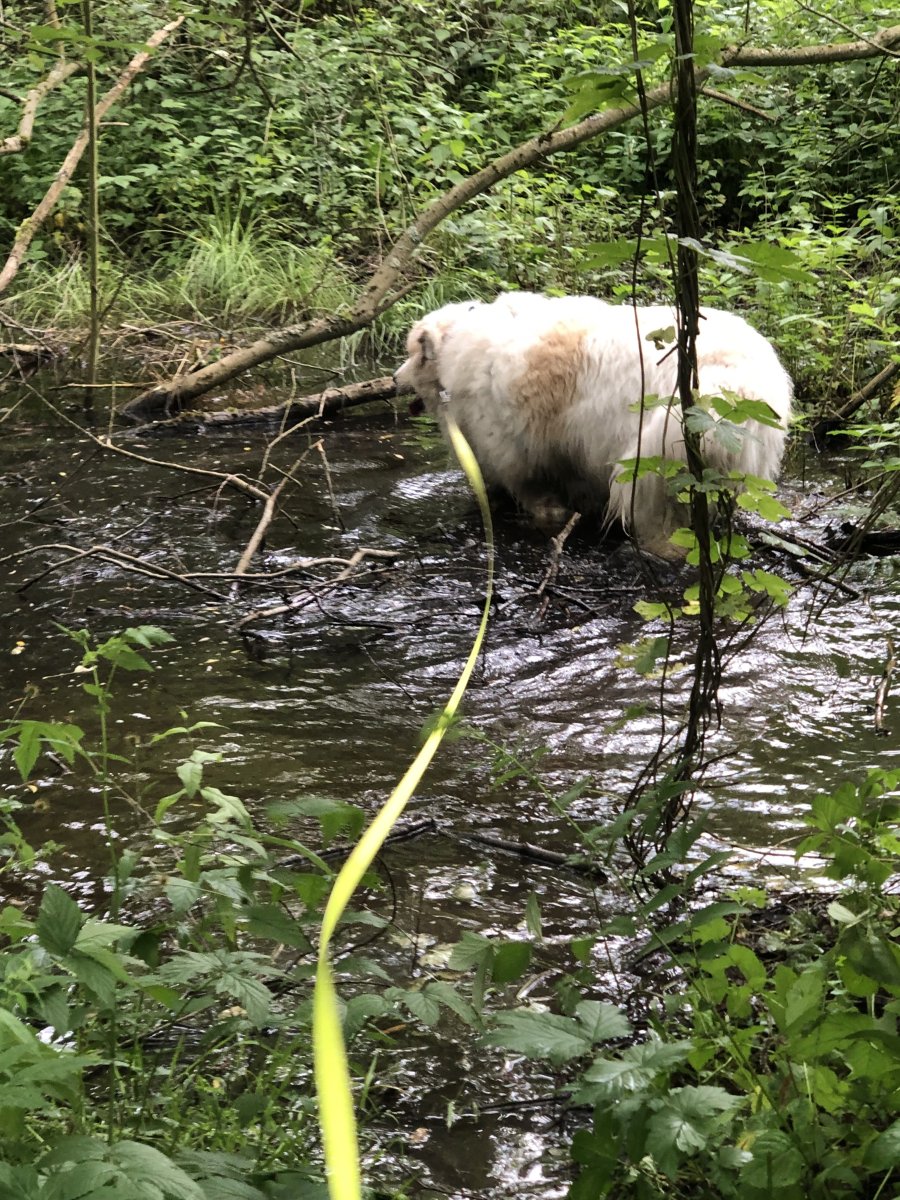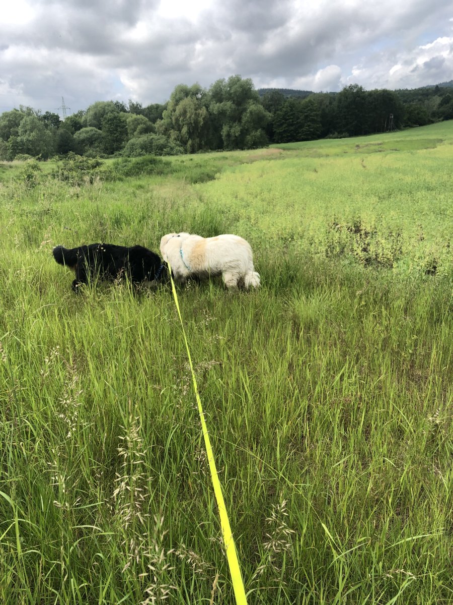 Já dneska přijela v půl desátý od doktora a bylo tak hezky příjemně pod mrakem a pofukoval větřík, tak jsem hned vzala pesany na prochajdu. Sice na cestě bahno, louže, tekoucí voda ve stružkàch… no tak alespoň Ginuš nebude hic. A Gině se to moc líbilo… ale vylezli jsme na louku a slunce, horko.. naštěstí i tam jsme šli defakto loužema a Gině se to moc líbilo a když jsme v lese ještě objevili tůňku, hlubokou tak akorát po bříško, tak to bylo max. A ona by šla furt dál, ale vzhledem k tomu horku a jejímu kožichu jsem to otočila a ještěže tak… toho měla madam plný brejle…jak jsme vyšli z cestičky za zahrádkama k prvnímu baráku resp. k jejich garáži, kde je to ve stínu a před garáží mají dlažbu, tak tam sebou plácla a prej.. tady je to fajn a já už nikam nejdu. To byla teda známka, že jsme to fakty přepískli. No tak jsme si tam posedali, polehali, že si teda odpočineme a za chvíli koukám na Ginu, že když viděla, jak jsme se usalašili všichni, tak jako “ dobrou, já si schrupnu”… no tak chtě nechtě se musela zvednout a dojít ten kousek domů, nebudu dřepět třeba 2 hodiny u cizí garáže a čekat až se madam vyspinká.