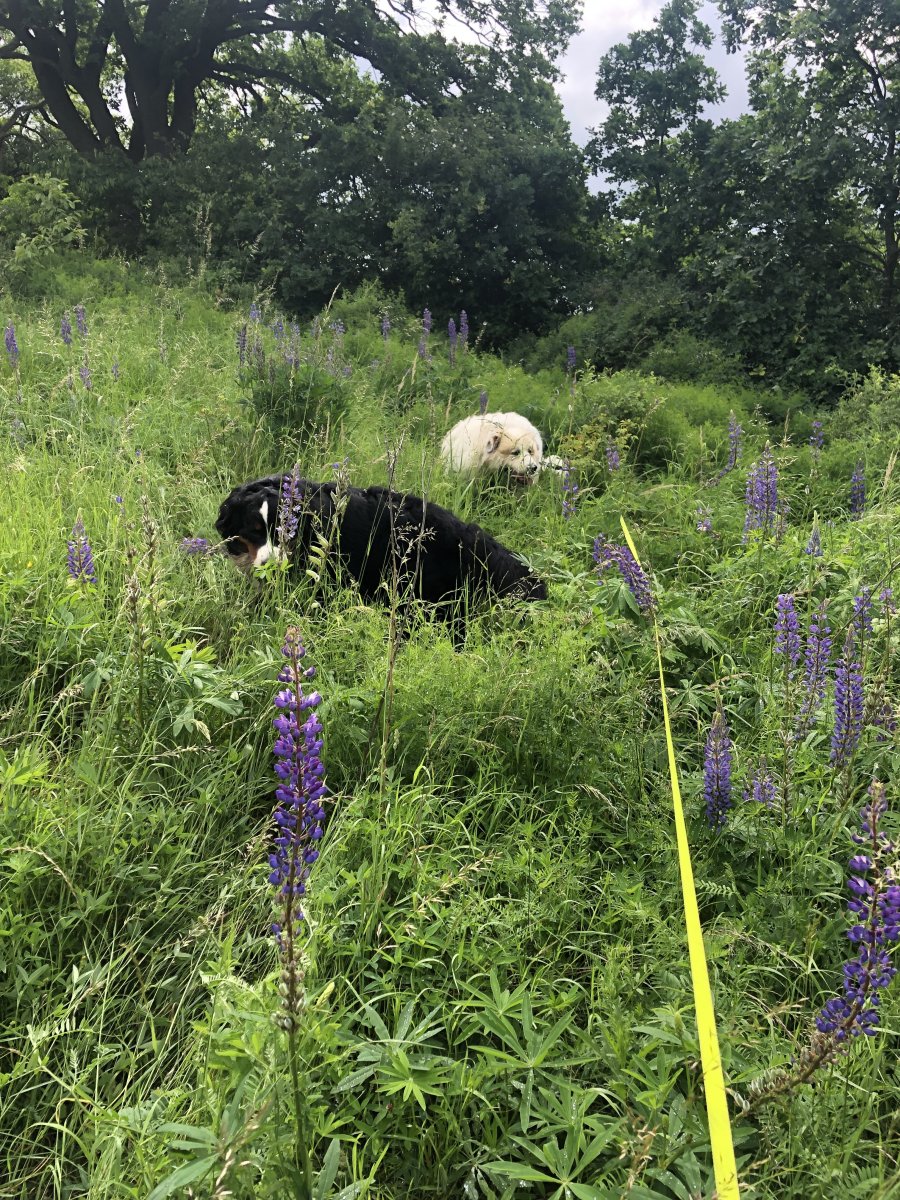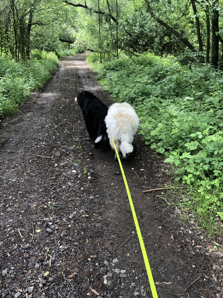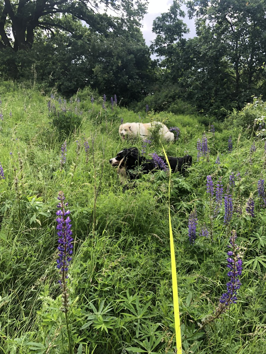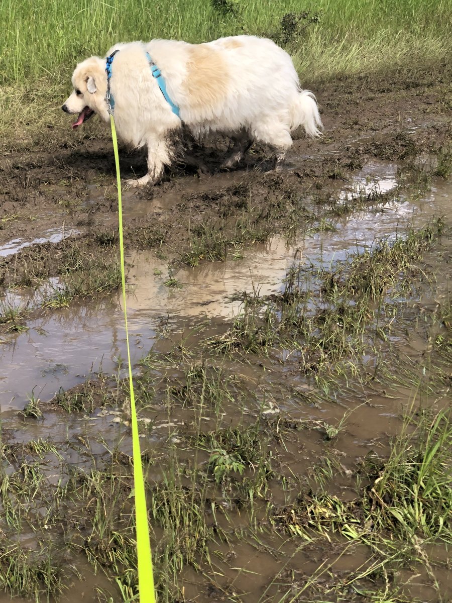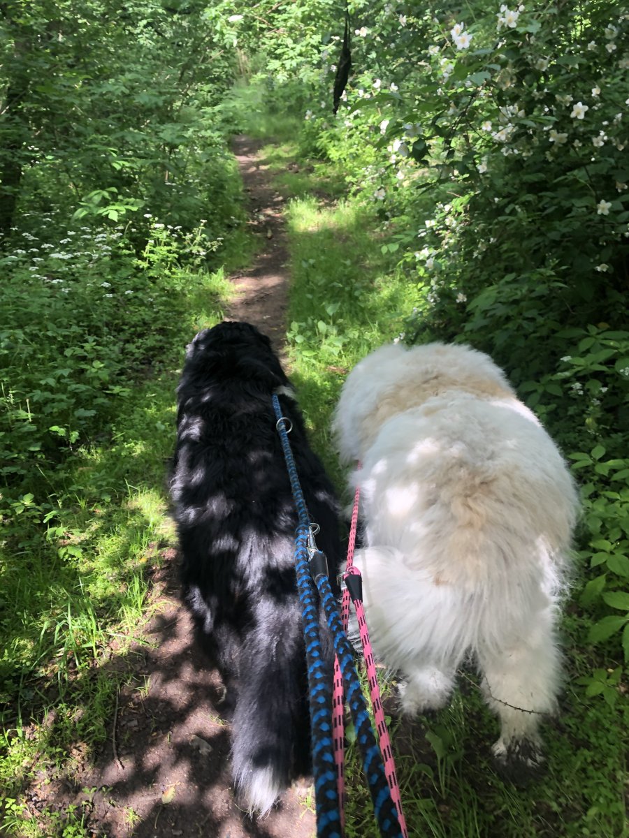 Já dneska přijela v půl desátý od doktora a bylo tak hezky příjemně pod mrakem a pofukoval větřík, tak jsem hned vzala pesany na prochajdu. Sice na cestě bahno, louže, tekoucí voda ve stružkàch… no tak alespoň Ginuš nebude hic. A Gině se to moc líbilo… ale vylezli jsme na louku a slunce, horko.. naštěstí i tam jsme šli defakto loužema a Gině se to moc líbilo a když jsme v lese ještě objevili tůňku, hlubokou tak akorát po bříško, tak to bylo max. A ona by šla furt dál, ale vzhledem k tomu horku a jejímu kožichu jsem to otočila a ještěže tak… toho měla madam plný brejle…jak jsme vyšli z cestičky za zahrádkama k prvnímu baráku resp. k jejich garáži, kde je to ve stínu a před garáží mají dlažbu, tak tam sebou plácla a prej.. tady je to fajn a já už nikam nejdu. To byla teda známka, že jsme to fakty přepískli. No tak jsme si tam posedali, polehali, že si teda odpočineme a za chvíli koukám na Ginu, že když viděla, jak jsme se usalašili všichni, tak jako “ dobrou, já si schrupnu”… no tak chtě nechtě se musela zvednout a dojít ten kousek domů, nebudu dřepět třeba 2 hodiny u cizí garáže a čekat až se madam vyspinká.