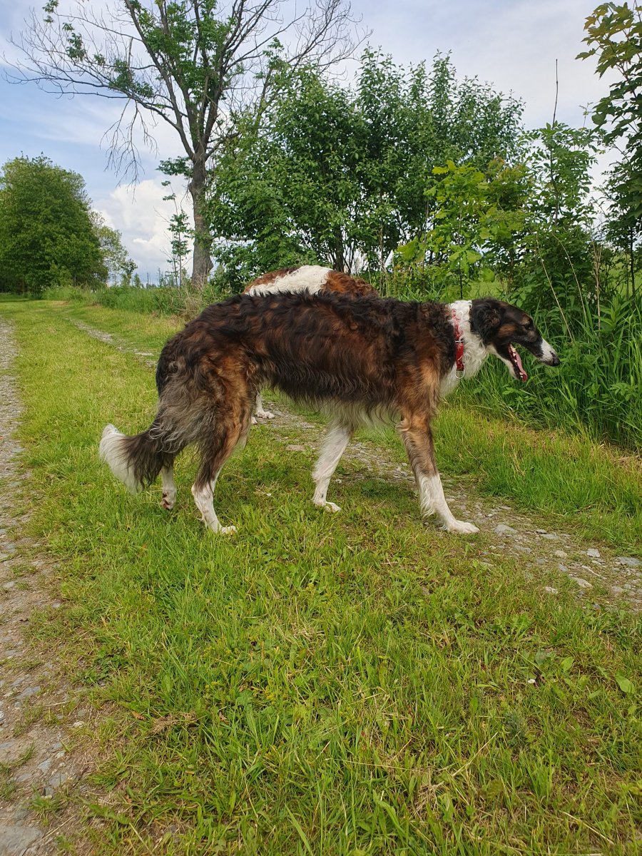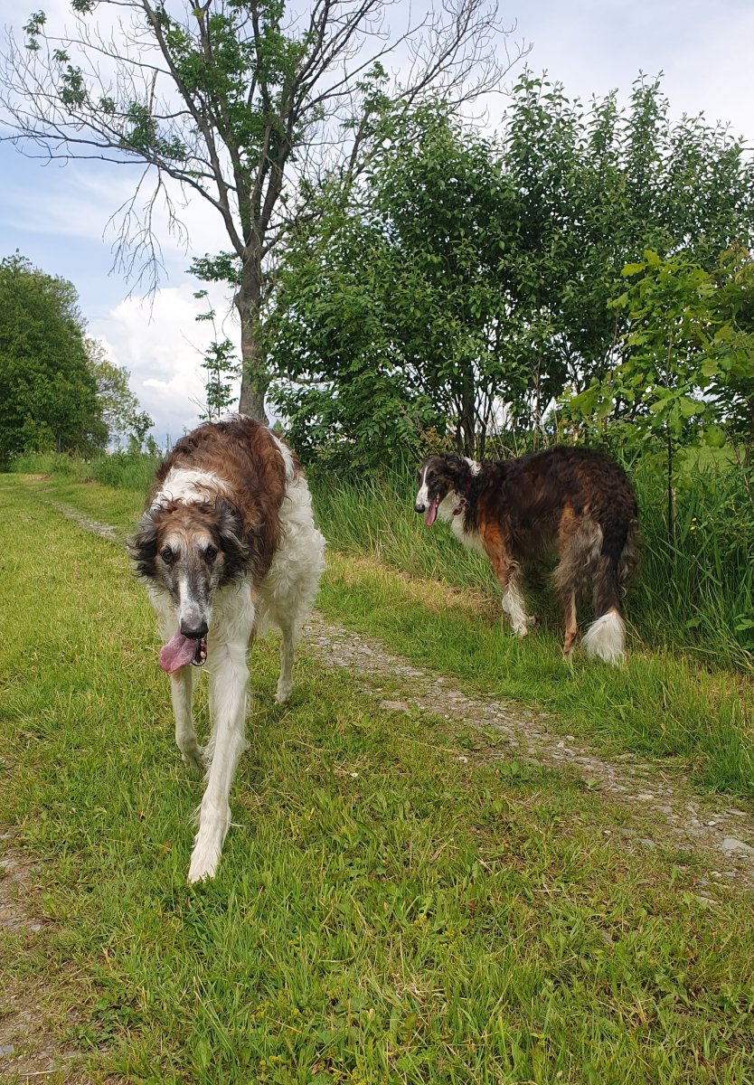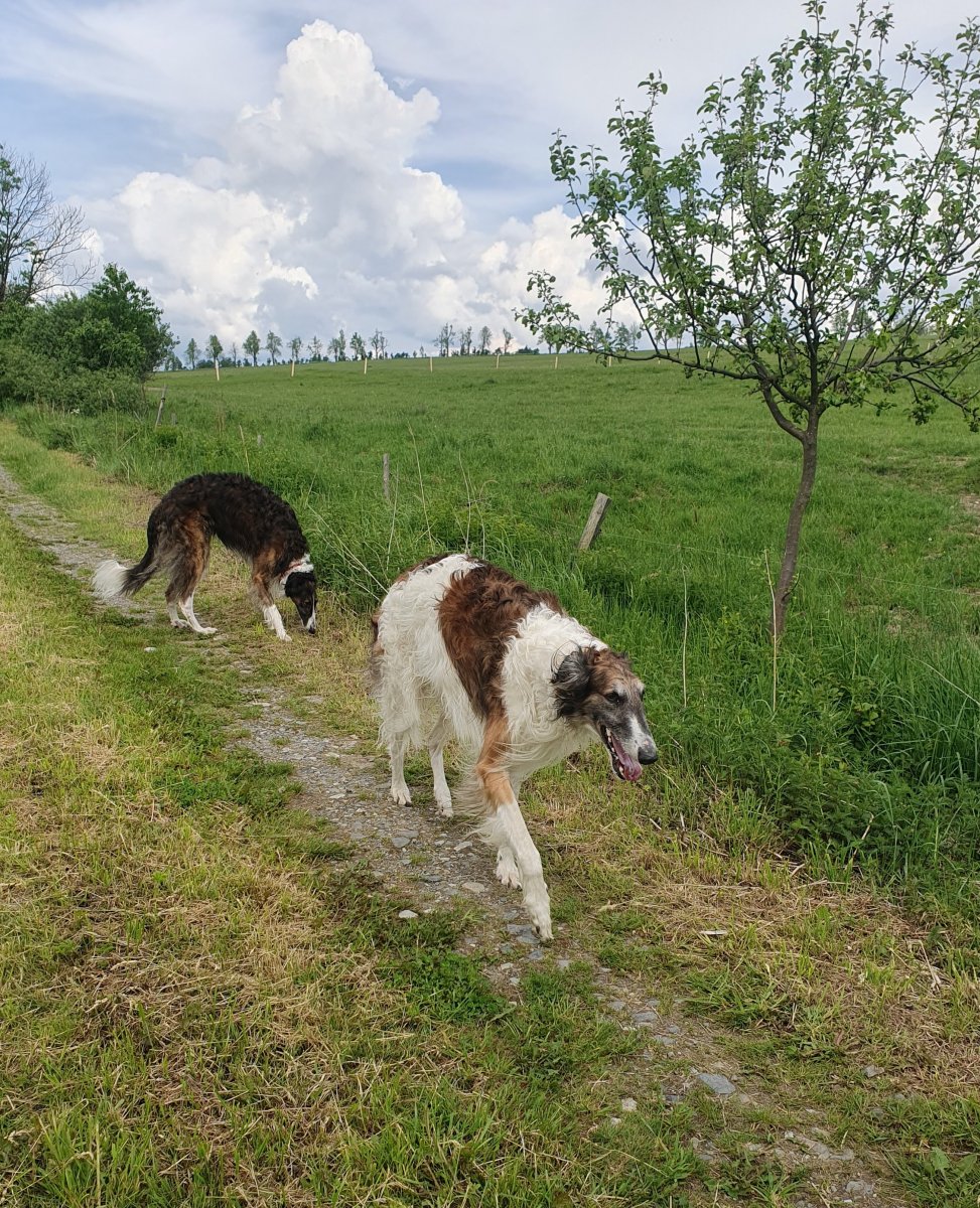 Dublinbarzoj:A zpět k venčení. Oblíbená procházka mezi pastvinami, kluci mají rozhled. A barzojí nos😀