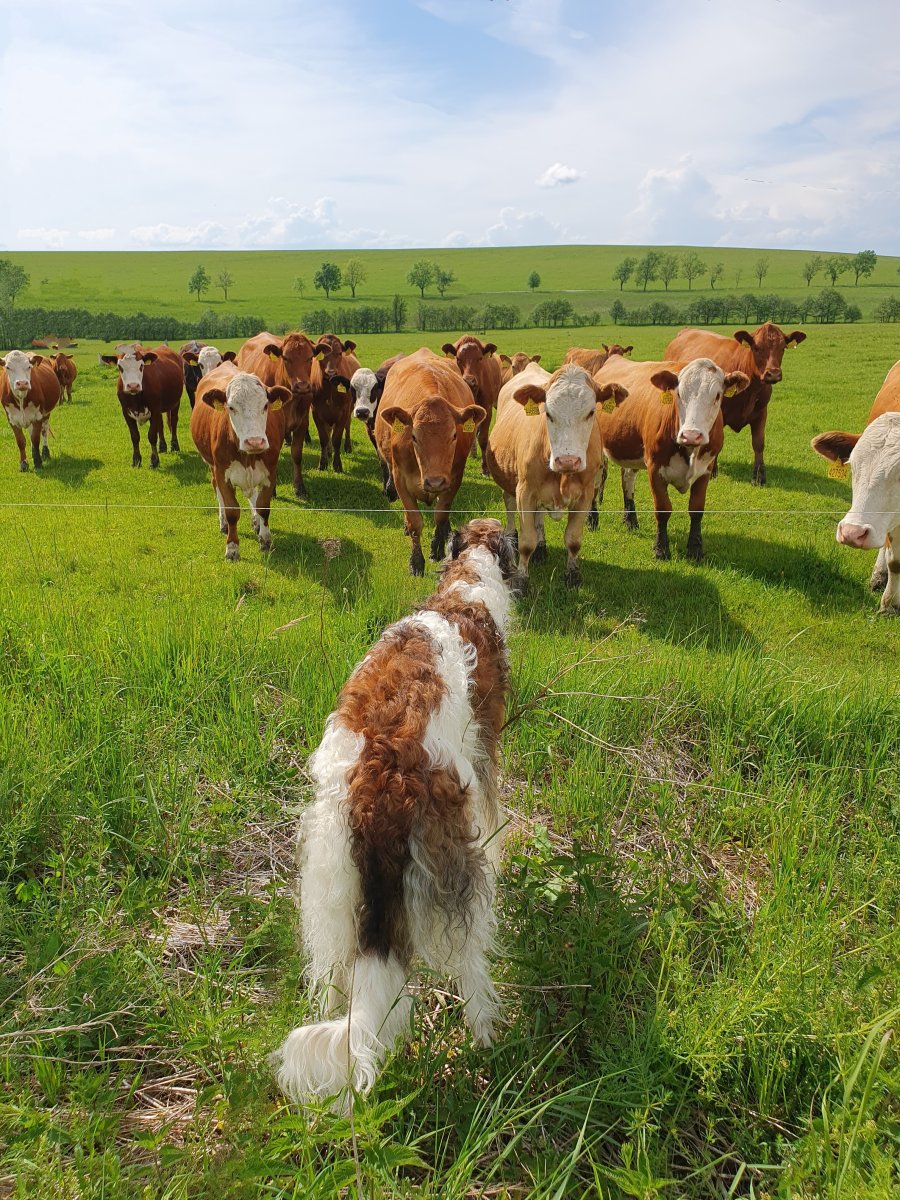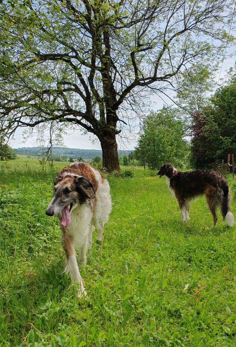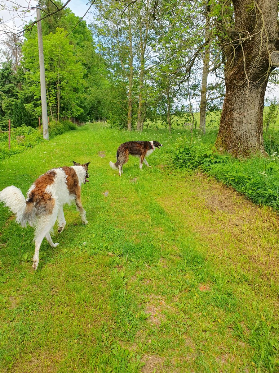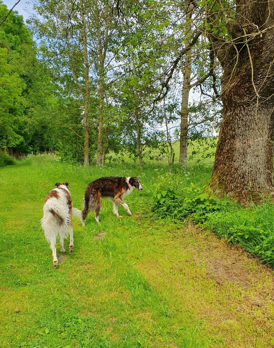 Dublinbarzoj:A zpět k venčení. Oblíbená procházka mezi pastvinami, kluci mají rozhled. A barzojí nos😀