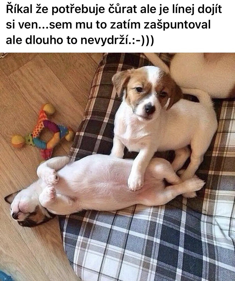 Máťa je na flexině, aby se alespoň trochu popoběhal, když musí být v parku na vodítku…flexi nedržím v ruce, ale mám jí pověšenou přes plece na dalším vodítku. Za normálních okolností Máťu ukočíruju normálně povelem, aniž bych musela brát flexinu do ruky a korigovat mechanicky vzdálenost ode mne, ale….u nás někde v sousedství hárá některá z fen, tudíž z Máti je ukňouraný stvoření, které reaguje na pejsky intenzivněji a když už je těch pejsků moc moc moc, tak už je vidět, že je z toho rozhozenej…na povely sice reaguje, ale po povelu nepřijde prostě do mojí blízkosti, jak to dělá běžně, ale oběhne mě…do toho mi zfanfrní Ginu, protože jeho hlasový projev…kňourání…je intenzivnější a Gina vyráží směr cizí pes, ale je slušně vychovaná, takže jakmile napne vodítko, tak se automaticky vrací ke mně…k noze, bohužel má ode mne debilně naučeno, že mě při přiřazení k noze obchází….takže já totál zamotaná flexinou s Máťou a Gininým vodítkem…no komedie, než jsem to rozmotala, moc tomu nepomohla pejskařka, která se kus od nás zastavila a pozorovala moje pachtění, aby mi sdělila, že mám moc hezký psy…Máťu teda připla na klasický vodítko…rychle jsme dooběhli park a trandili raději dom.