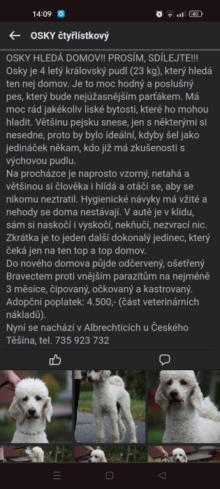 Tak nevím proč nejde odkaz otevřít. Útulek Čtyřlístek pro hafany má v nabídce krásného velkého bílého pudla. Hned jsem jsi vzpomněla na Thielli, že by se jí hodil k děvčatům.