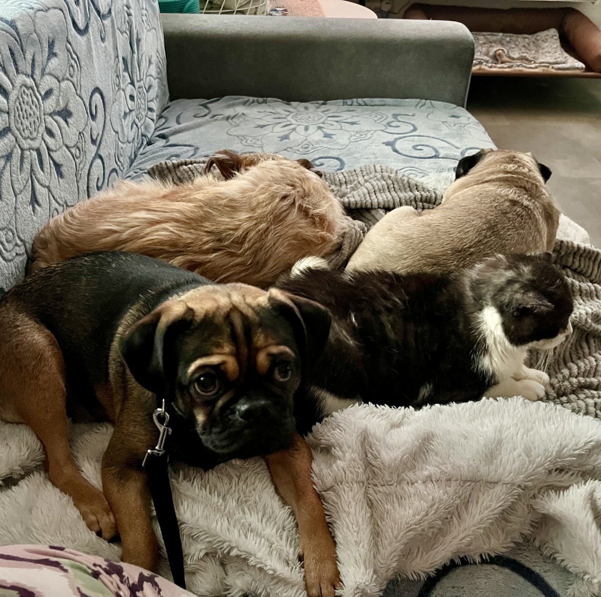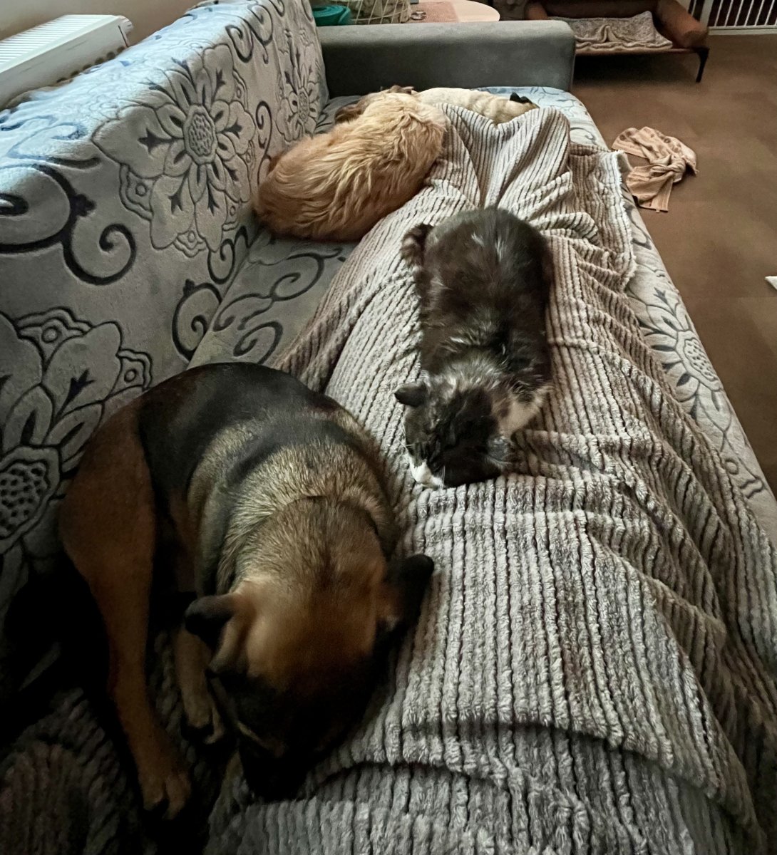 Nejdřív páníček a ten to pak prsknul na mě. Psíci ok. Na to, že nebyli chudinky tři dny venku, tak se chovají víc než slušně ❤️