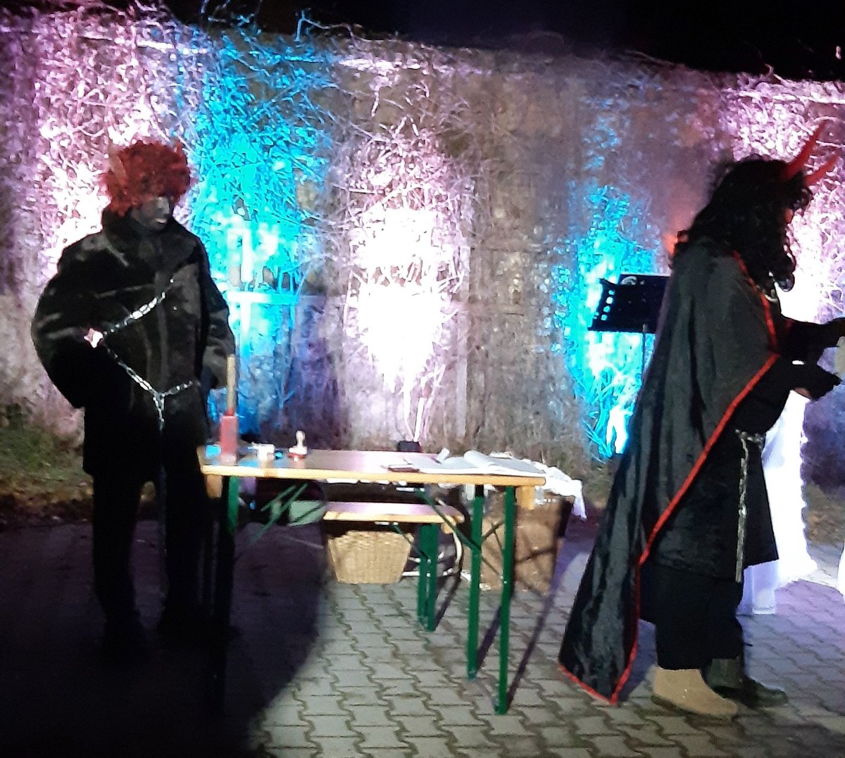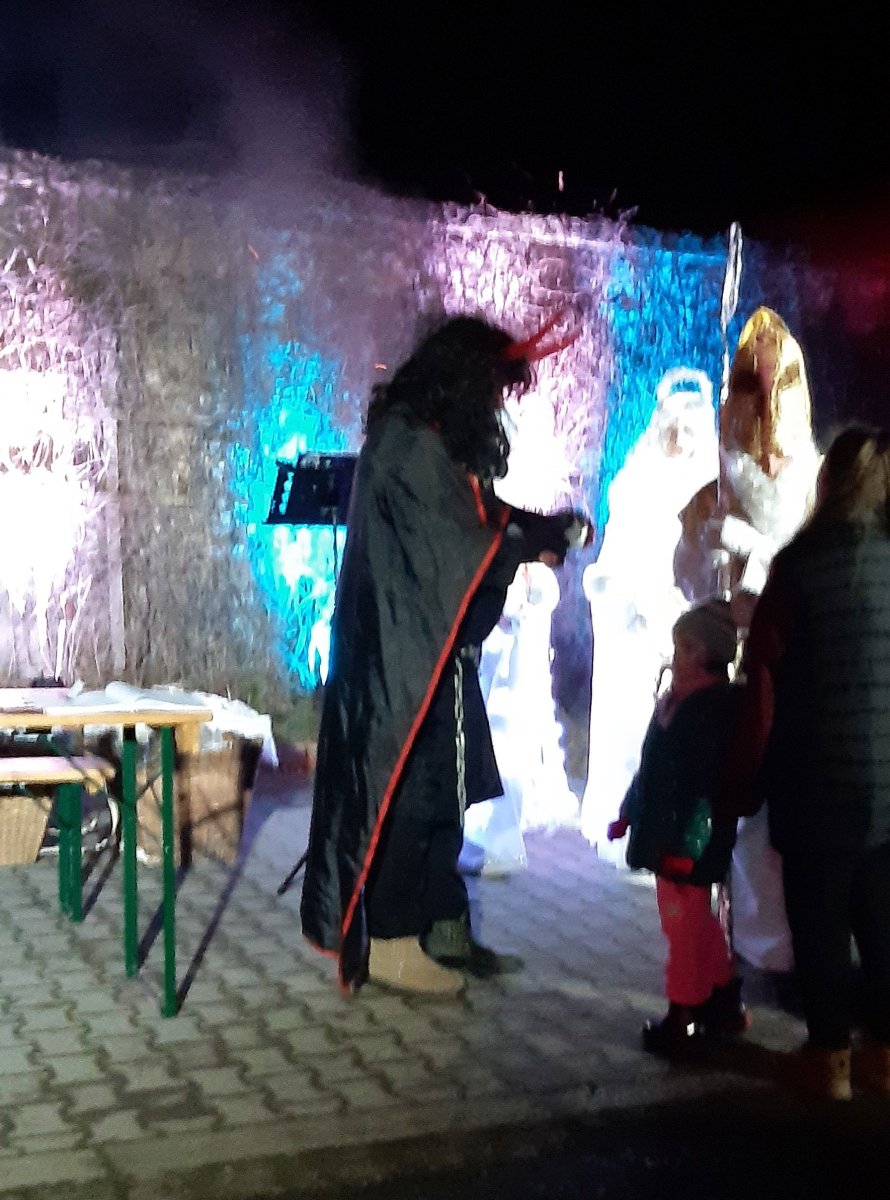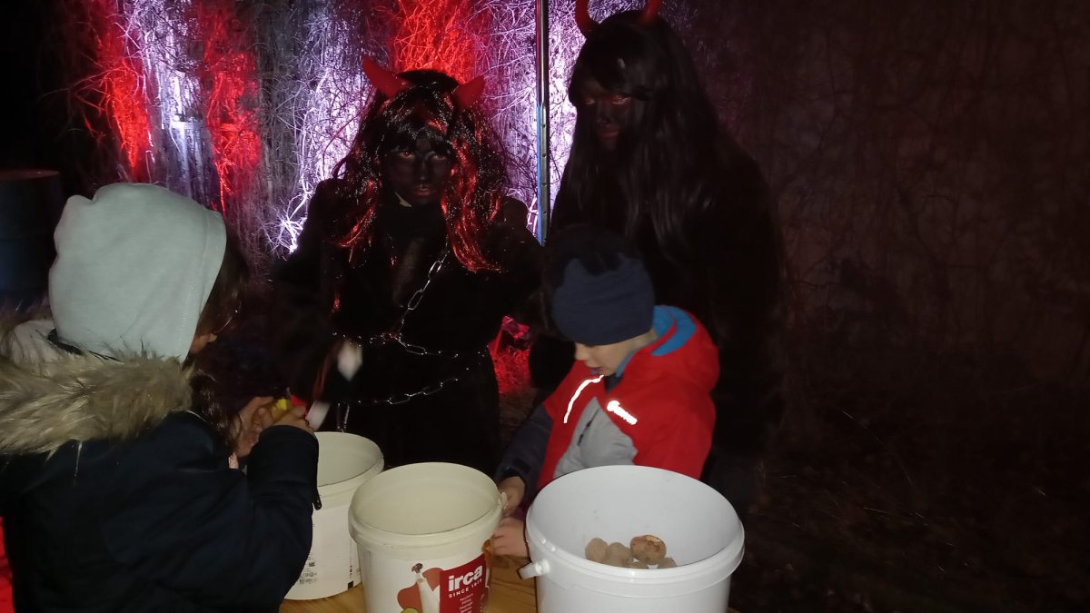 Tady bylo celé peklo i s ohnivým příjezdem,kotli,váhou,klecí na zlobivé děti a třeba i s loupáním brambor.Pes nejdříve na ty ohně,měnící se barvy a hluk koukal trochu nedůvěřivě,ale pak už v pohodě.Jen na jednoho čerta,co na něj udělal blebleble,taky zavrčel aby si nemyslel,že si z něj sedne na zadek.