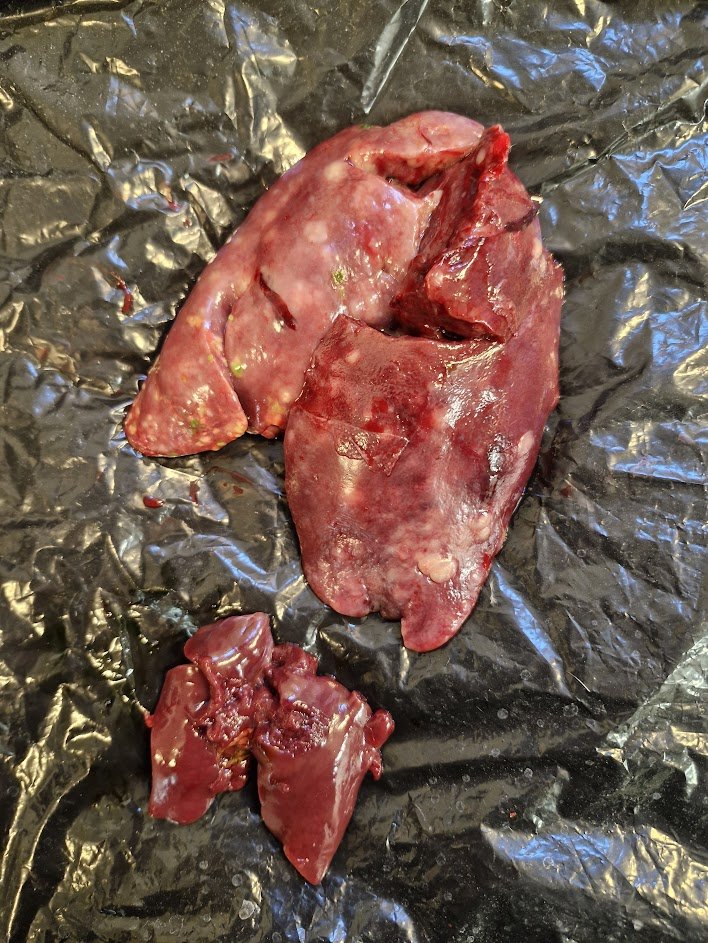 to nahoře jsou její játra a ta játra dole jsou játra spolubydlící, co spáchala sebevraždu na elektrickém ohradníku, tzn. normální játra