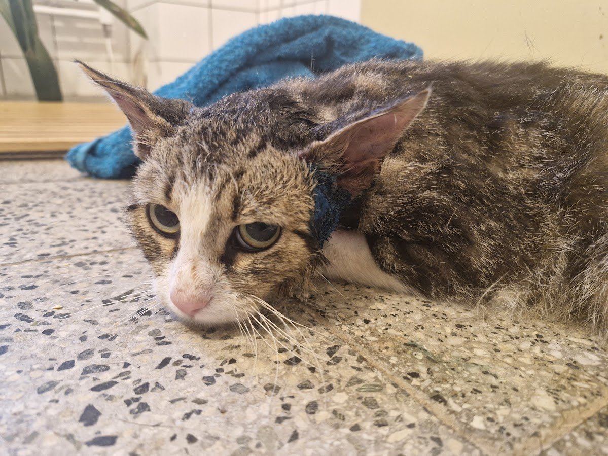 tak jsem doma nasadila hromadu rukavic, oholila jsem všechnu tu špinavou srst s muším potěrem, betadinka, alamycin. kolem krku a u uší je teda sedřená kvalitně, taky pořezaná jedna noha asi jak to chtěla sundat.