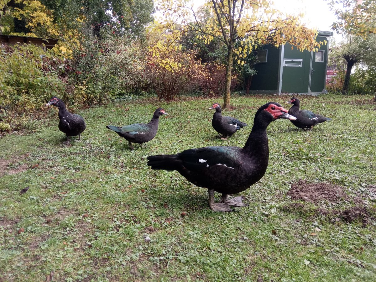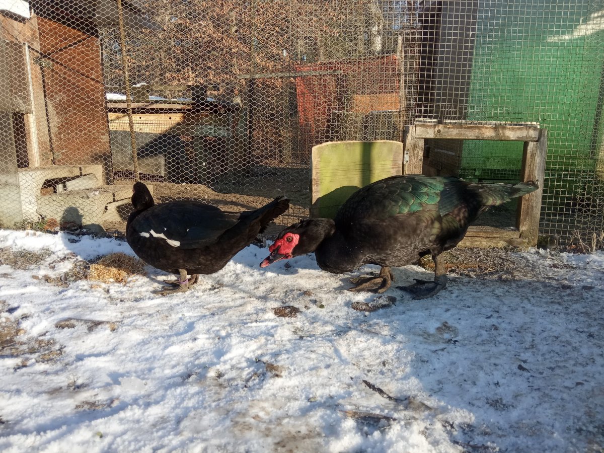 Přidám pro potěchu oka foto svého chovného hejna 2.4. Divoce černě zbarvené, byť u některých jedinců na hrudi/hlavě ojedinělá bílá pírka (o bílém zrcátku na křídlech nemluvím, to mají v dospělosti úplně všechny pižmovky včetně divokých). Chovní kačeři jsou oba lončáci, větší “Vazoun Vrtichvost” z odchovu pana Panáče, menší “Antracit” (pročernělý obličej) z odchovu paní Pazderkové. Aktuální hmotnost Vazouna 6,20 kg. Antracit 5,70 kg. Kačky se pohybují kolem 3 kg. Mám u sebe teď i pěkně vyspělého letošáka “Krasavec Krampus” syn Vazouna, z květnového líhnutí = 5,50 kg; ten půjde do měsíce k chovatelce do Prahy.