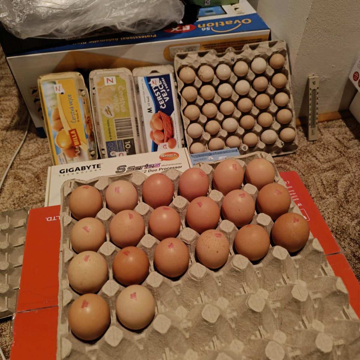 No, já nějak moc neočekávám.. Když sem viděl novýho kohouta, jak mu to totálně nejde, chytne slepici za hlavu, ta řve a von stojí čelem k ní a netuší co má dál dělat.. Když už na slepici vyskočí, tak vrávorá a spadne.. Dal sem 4 vajíčka do líhně na zkoušku oplozenosti a všechny se začaly vyvíjet.. Tak sem objednal pro jistotu 30 násadovek z Gyronu.. Přišlo to rozflákaný, z deseti vajec sem měl omeletu, ostatní sem musel očistit, tak doufám, že ten rozetřenej žloutek nezalepí póry na násadovkách a ty nárazy nedodělaly dílo zkázy úplně.. Takže palce i pěsti nutno držeti 😄