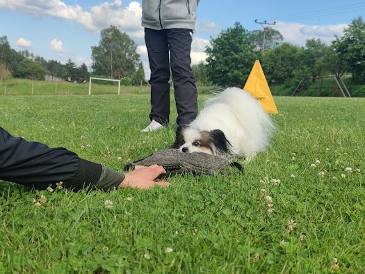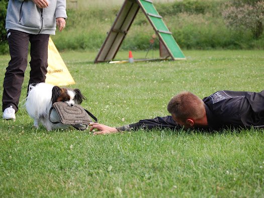 ….obrana je náplň jiných zkoušek, na ty my nechodím, na ty jje motýl moc malý, ale chystáme se na příští rok na zkoušku ZMPO, kdy pes musí oběhnout 4 makety, vyštěkat figuranta, pak je tam myslím že výslech a bočni doprovod figuranta, odolnost proti nápřahu a hlídání predmětu…
