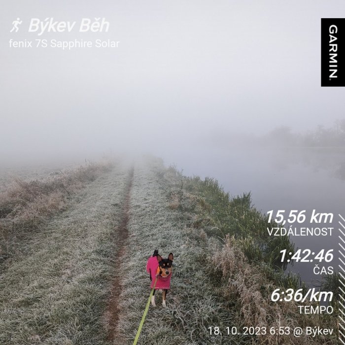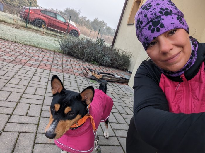 Středeční vyběhnutí v mrazu. Bylo lehce pod 0, ta zima mi ani tak nevadila, spíš ta mlha. Je to monotónní a moc to neutíká, když člověk vidí jen pár desítek metrů před sebe. Až po doběhu jsem si všimla, že jsem se barevně sladila se psem…