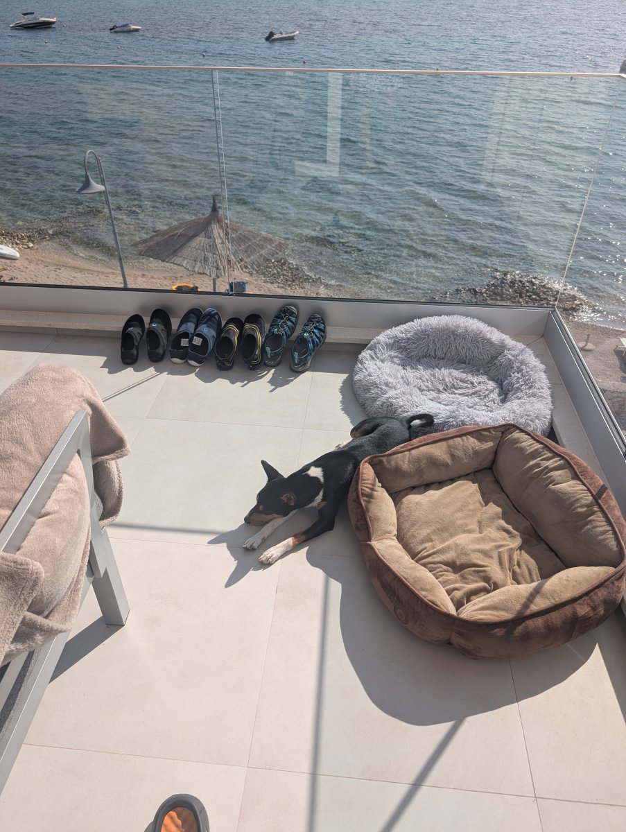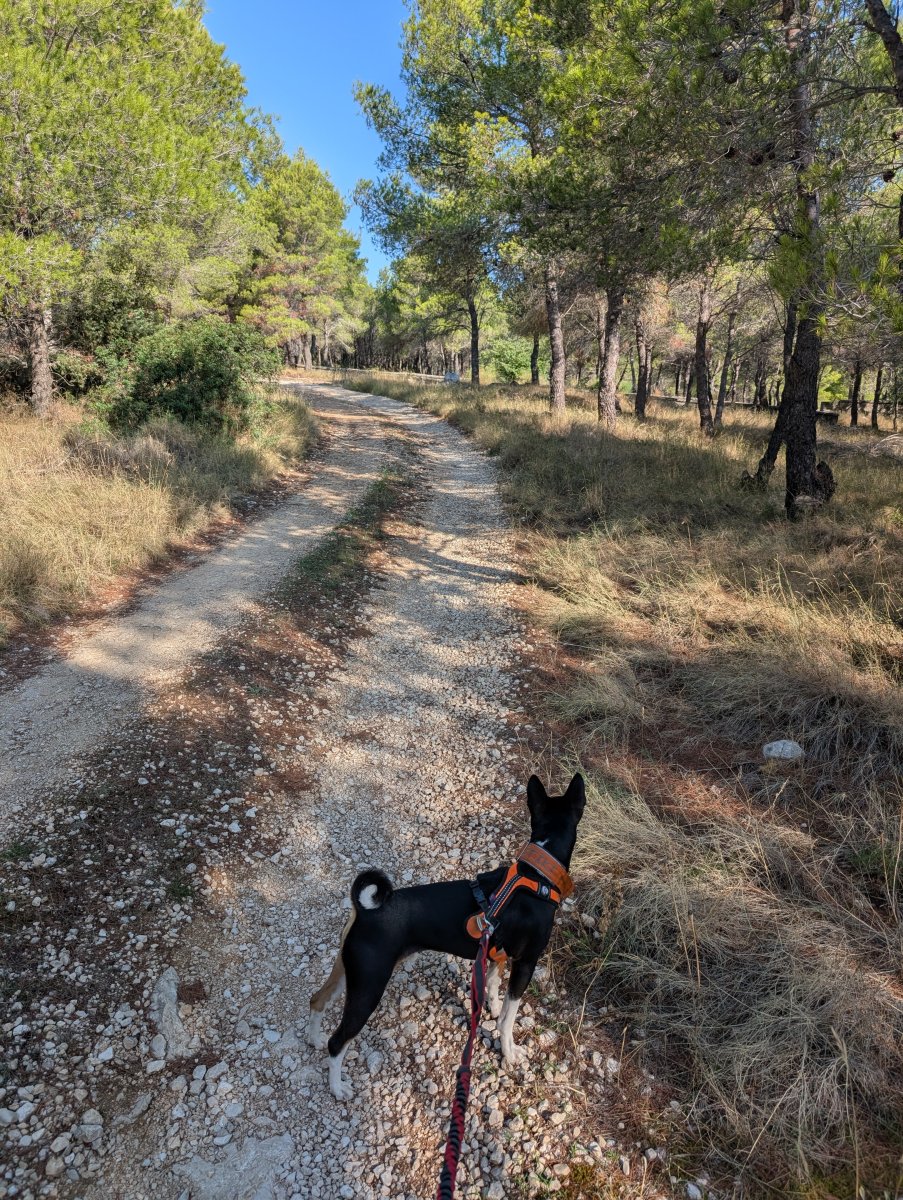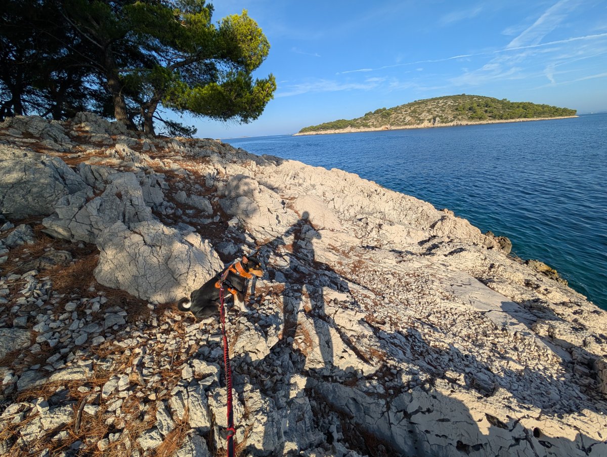 Zdravím z dovči v Chorvatsku. Venčíme (běháme) ráno, dneska vinice, olivový a borovicový háje nad námi. A teď odpoledne opakovačka na terase. Před pár dny po pláži a borovicový lesík na poloostrově kousek odsud... Do vody jsem je zatím moc nedostala. Quie vůbec, ten šel max na 2m k moři a pak utekl před vlnkama. Efík chtěl vlny lovit tak si trošku smočil tlapky, ale dál taky nešel.