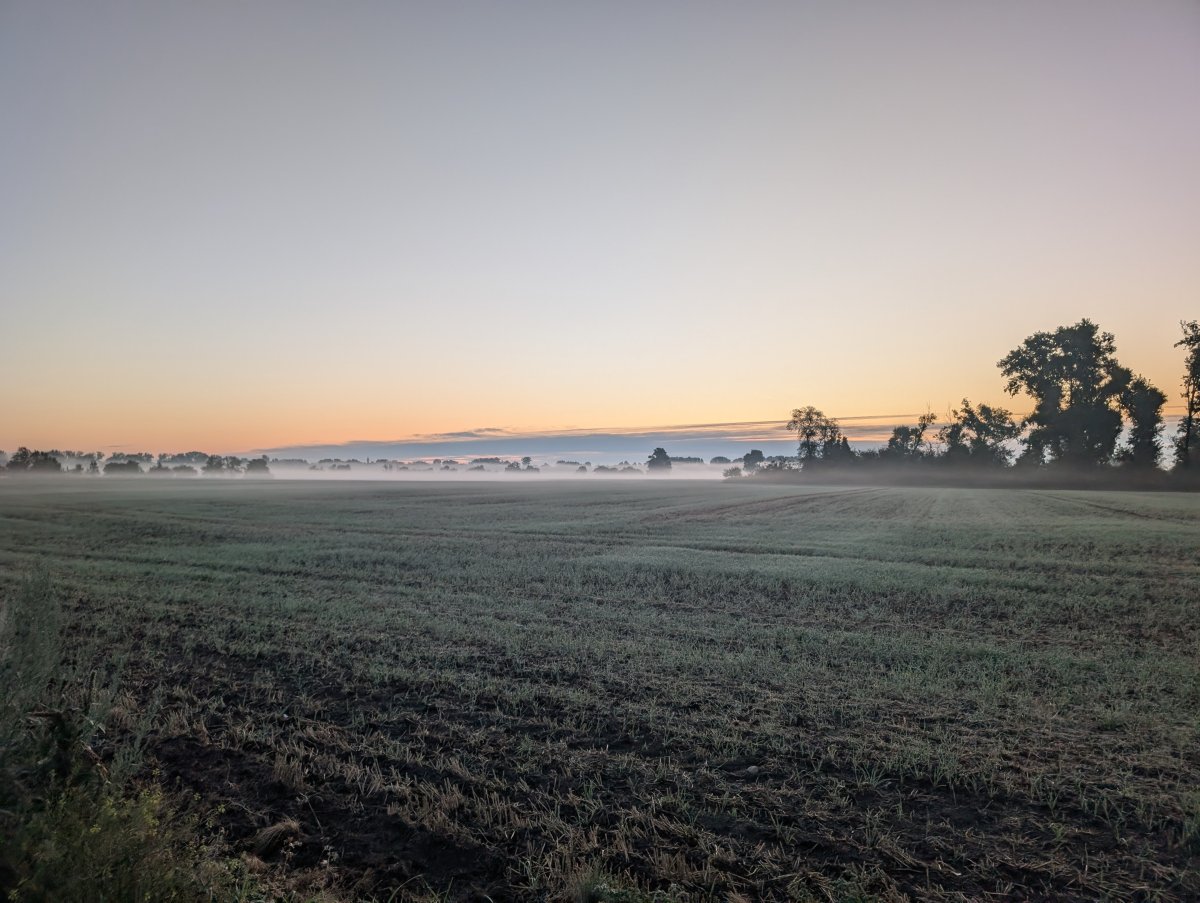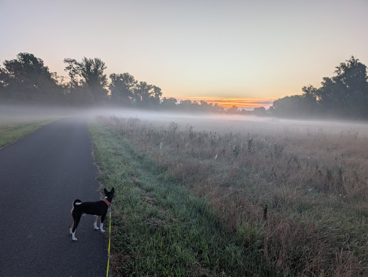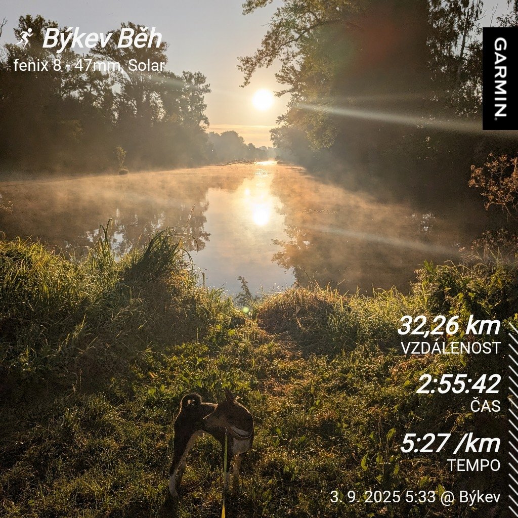 U nás dneska takhle. Tyhle pozdně letní rána miluju ... V plánu byl (nejspíš) poslední dlouhý běh (pro mě aspoň 22km) před podzimním maratonem. Počasí parádní, bylo nádherně, příjemná teplota, mlha. Vyběhla jsem před svítáním, tak abych nemusela s čelovkou. Na to že jsem si o víkendu běžela Jizerskou 23km, se mi běželo parádně a i tempo se drželo samo, měla jsem v plánu se držet kolem 5:30-5:35, nakonec to bylo o chlup rychlejší... Tohle ranní běhání se mi líbí. Jen Efíka jsem po 20km odvedla dom, už mi na něj těch 30km přijde dost. Ale i on vypadal hodně spokojeně, jiná trasa, koukal, čuchal , ale šel hezky v tempu se mnou... A jinak Efík teď v pohodě cystiny pod kontrolou i na skoro normálních granulích. Jen jich má vzhledem ke svému pohybu slušnou hromadu... A packy taky ok. Na podzim plánuju zase běhat na Kokořínsku v lesích. A já si snad příští rok dám první opravdový ultra... Zatím mám v plánu celýho "Čerta" - skoro 67km, přes 1600m převýšení, Bezděz, Ralsko...