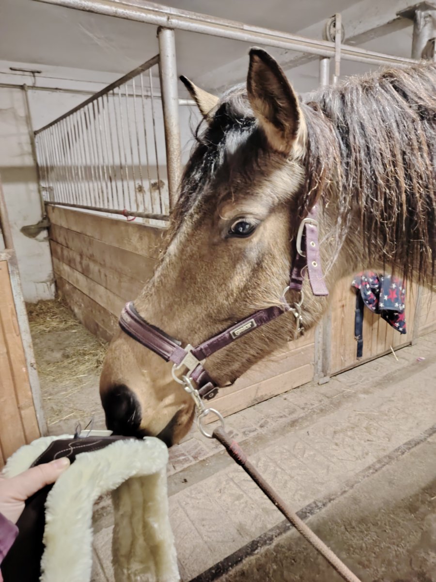 Ale už jsme měli podezření předloni během obsedání, kdy jí vadilo sedlo- ale při detailnějším pozorovnání je to hlavně podbřišník. A teď to tak má taky, podbřišník si nenechá dopnout, nestojí, pořád popochází a točí se kolem mě… Je dost možný, že je jen dominantní a zkouší co si může dovolit a schovává to za ‘nepohodlí".