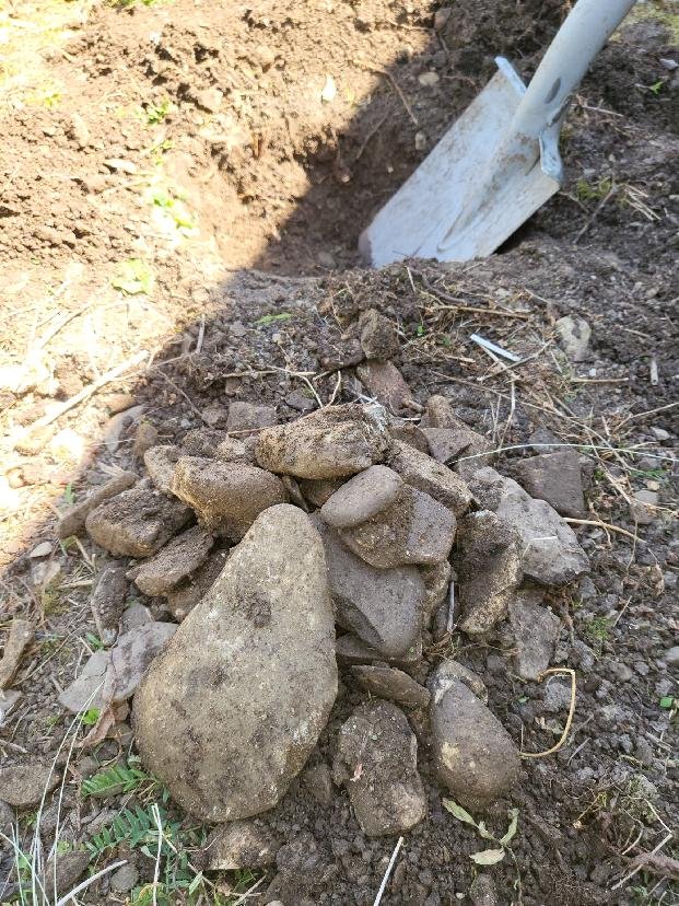 Nedávno sme řešili kytky, sázení a já jsem si vzpomněla, že jak jsem dopředu ke zdi přesazovala jednu kytku, tak jsem naivně šla kopat dírku rýčem, protože nemusela být nějaká velká. Vím, že vpředu je jen kamení a kamení, málem jsem si zlomila zápěstí, jak jsem do toho ďubala špičkou rýče a snažila všechno odtud dostat. Vyfotila jsem pro názornost: vzadu velikost jamky s rýčem, vpředu hromada kamení, co jsem odsud dostala. Všimněte si, že hlína tam vlastně prakticky žádná nebyla🙄 U nás se normálně sází krumpáčem.