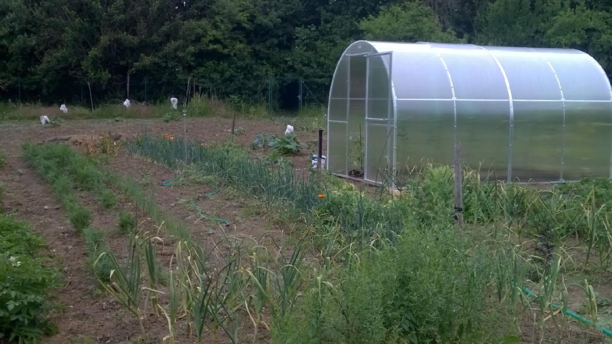 Tu je to trochu vidět, jak jsem fotila kámošce skleník. Za skleníkem je ještě pás brambor.