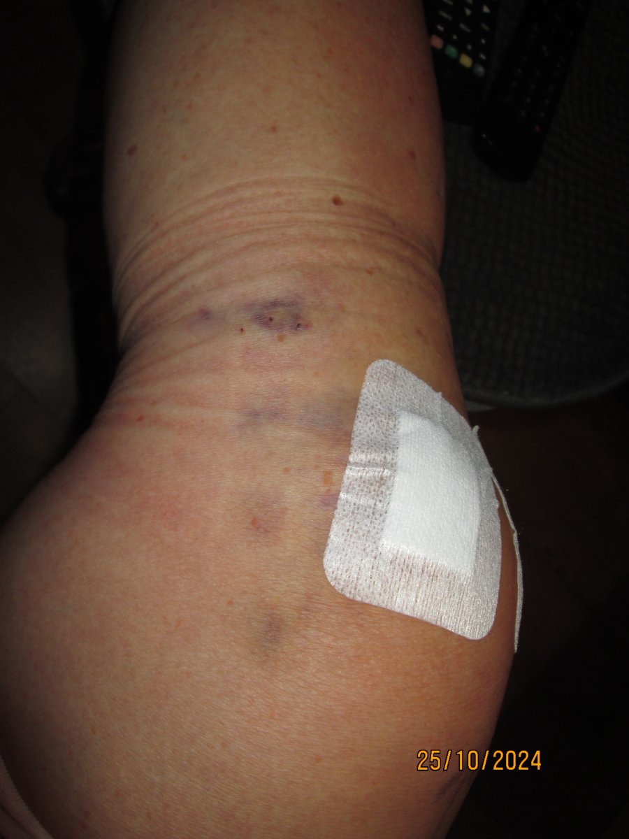 tak jsem si dnes ráno odmotala ten obvaz..už jsem nemohla vydržet,ale ty 2 dny určené jsem to vydržela...Už v nemocnici jsem hlásila,že mi to dost táhne..prý,že to není možné..Tak už můžu propínat-jako bych měla pod kolenem něco nacpaného….Mám to celé jaksi napuchlé..modřinové..Jsem začla brát Arniku montanu..Zapomněla jsem to bliknout,než jsem nalepila ty náplasti..