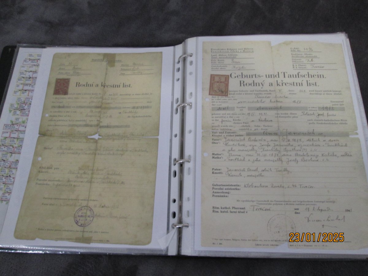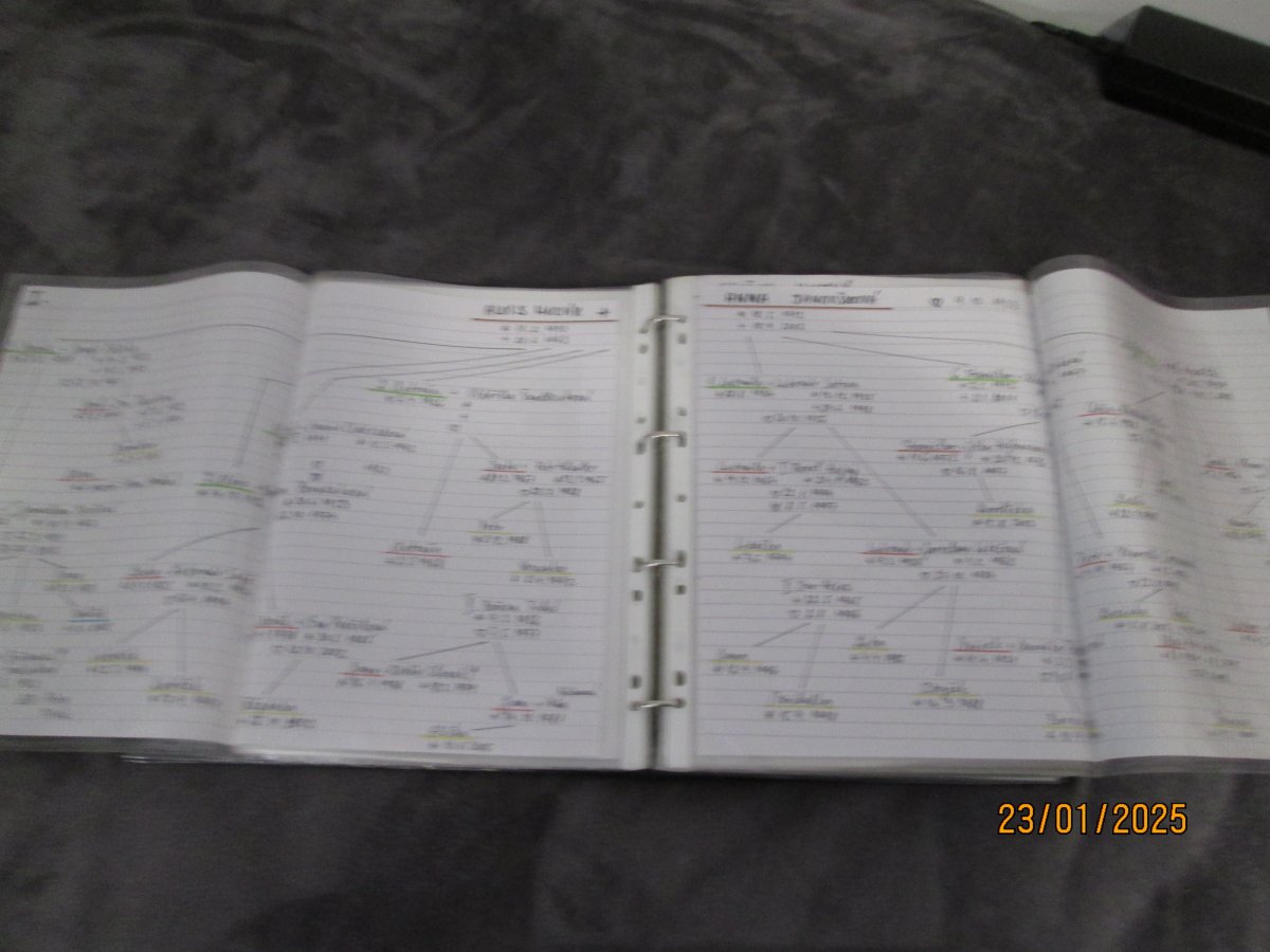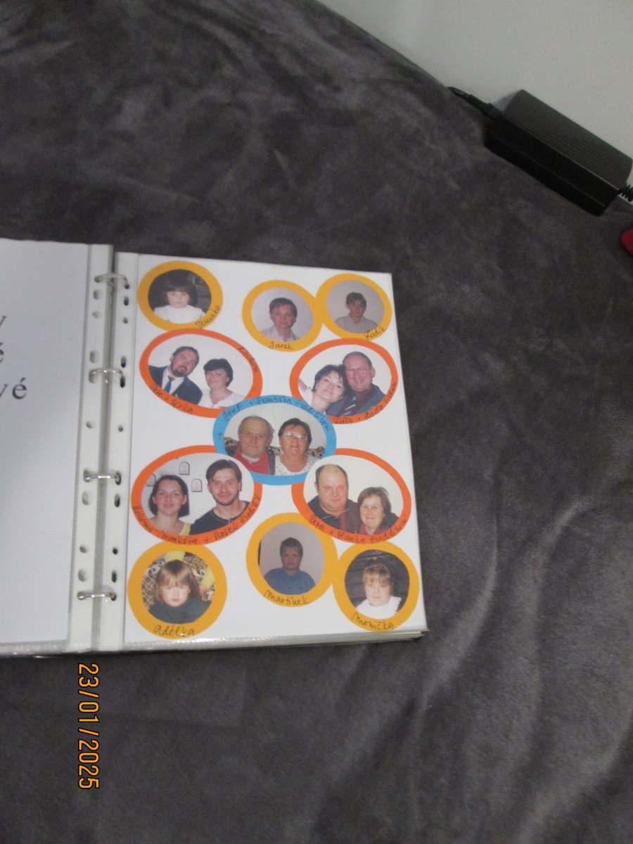 ten červený šanon je kapely..Tu jednu kroniku jsem otevřela pro představu..Za prvním listem jsou ti nestarší..Pak všechny rodné a domovské listy…Pak rozepsaná každá rodina (17 rodin) písemně…Barevně rozlišení rodiče-zeleně podtržení,děti-červeně a vnuci-žlutě..Pak ty kolečka..Každá rodina má svou “sekci”☝️..Za těmi kolečky má jednu stránku dospělí a druhou děti-poslední obrázek..To jsou fotky uprostřed rodiče v modrém kolečku,děti v červeném a vnoučata v oranžovém…Na tom stromě života je kmen-z toho jdou dolů kořeny-rodiče a prarodiče těch hlavních osob-rodičů mého chlapa..jejich rodičů..(1786 mám jejich poslední datum,jejich rodiče jsou tam jen jmenovitě,nesehnala jsem už jejich datumy narození)....Ti měli 9 dětí(jedno z nich-můj chlap).z toho 3 umřely 3 roky po sobě..Jedno mělo 5 měsíců,jedno ani né měsíc,a třetí 7 dní !..v roce 1916,1917 a 1918..si to nedokážu představit😟..pak měli ještě jedno..U každého je datum narození+ případně úmrtí,datum svatby-červené srdíčko..Přeškrtnuté značí rozvod..Tam jsou rámečky taky barevně rozlišené,jak všude jinde..I noví partneři..Každou jednotlivou rodinu spojují hnědé větve+ větvičky..