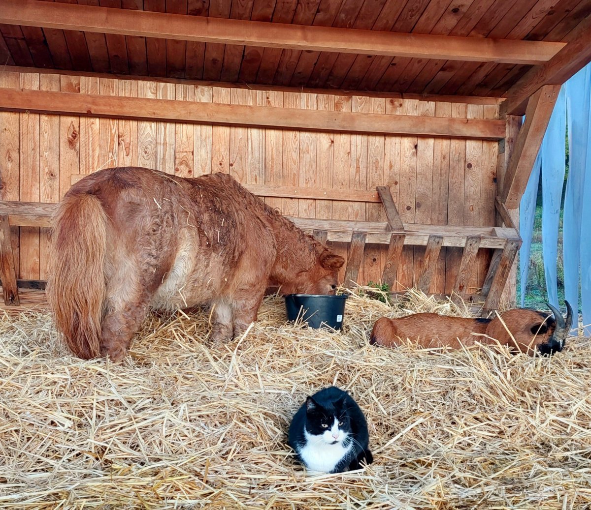 Tak jsem si dneska po celým týdnu pěkně mákla u zvířátek..v tom sněhu a mrazech jsem po práci vždycky řešila hlavně vodu a jídlo a nic moc se v tom nedalo dělat..dneska jsou u nás 2°C a už odtálo i dost sněhu(ale furt je ho ještě dost),tak jsem se pustila do kydání přístřešků a výběhu..a vyvážet to v tom sněhu v těch kolečkách byl zážitek😀Nadávala jsem,klouzalo to,zpocená jsem byla až za ušima..fakt pakárna..pak všude vyměnit vodu..naštěstí 1000 l nádrž rozmrzla,takže jsem to nemusela zahat nějak daleko a co se týče vody ve výběhu,tam teď jak to taje,tak chytám vodu rozmrzající ze střechy přístřešku..ale v příštím týdnu se mají zase vrátit mrazy,takže už teď jsem z toho otrávená..