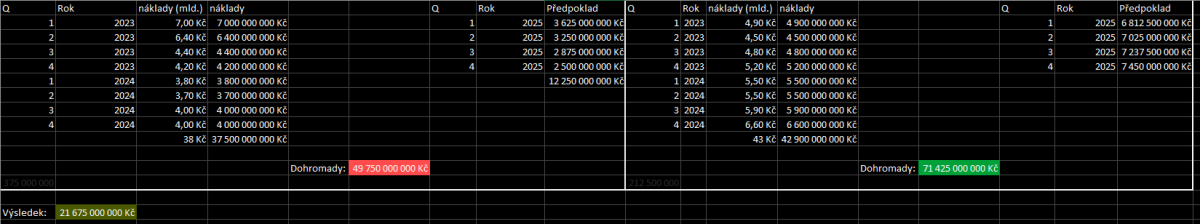 Zisk → Q1 2023 - Q4 2025: 49,75 - 71,425 = 21,675 mld (odhadem po Q4 2025)