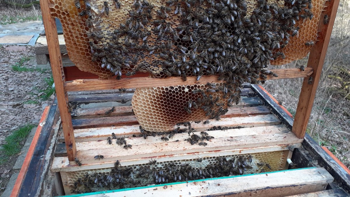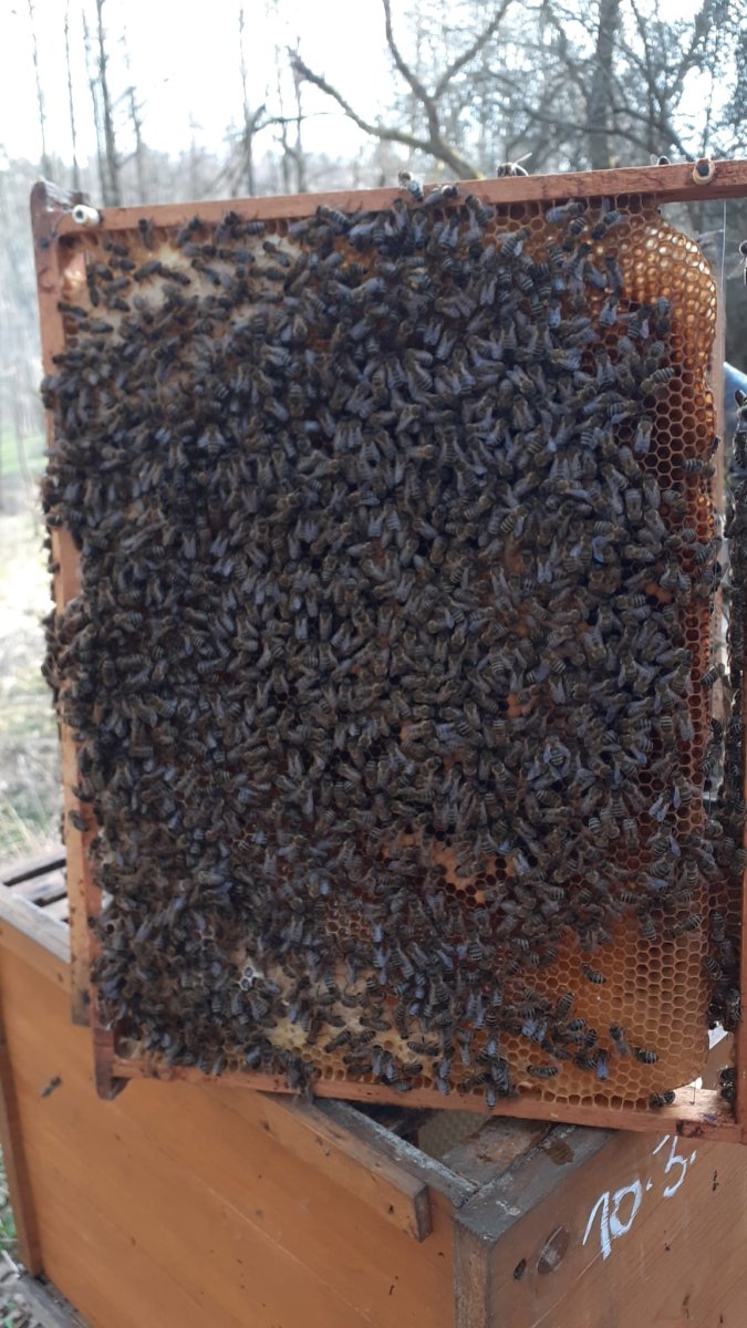 Dokvétá jíva. Ve vč se na HL objevují voskové hrbolky velikosti krupice - prostě včely už mají aktivní voskové žlázy, probouzí se stavební pud. V této době už vč hojně navštěvuje komoru a vynáší z ní zásoby, asi je už "přivrácená" strana zásobního plástu v komoře prázdná. Poškrábeme tedy druhou stranu a rámek otočíme aby byl otevřenými (jen poškrábat, ne odvíčkovat) zásobami k díře BP. Rámek uvnitř hnízda je asi skoro suchý a bez plodu. Zaměníme ho za SR. Takže k rozšíření = zvětšení "sediště" nedošlo, jen je poslední rámek uvnitř (poslední od česna, = vše je VŽDY podle česna) zaměněný za SR. Tam vč začne stavět první trubčinu. Nebude hned hezky žlutá, bude jakoby šedohnědá, včely použijí co kde v hnízdě ukousnou.
