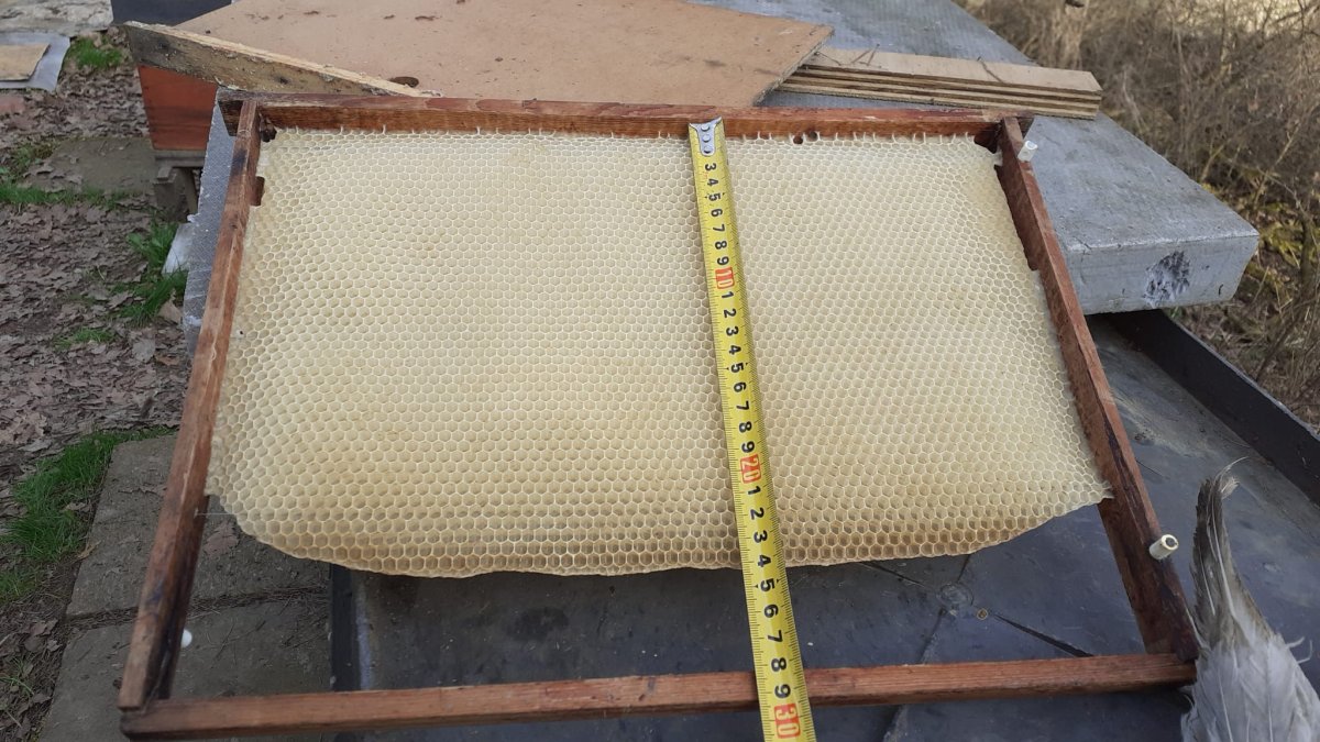 Byla vložena mezistěna pro 39x24 a ta je vysoká 215 mm. Na této fotce je zřetelně vidět, že včely pokračovali dělničinou a ne trubčinou jak jsem si já myslel