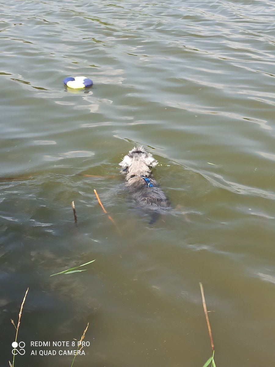 jak u nás,Dafi plave,taky až uvážu Žeryka,ona teda není moc extra plavec,2 krát pár metrů a konec,ale spon něco….