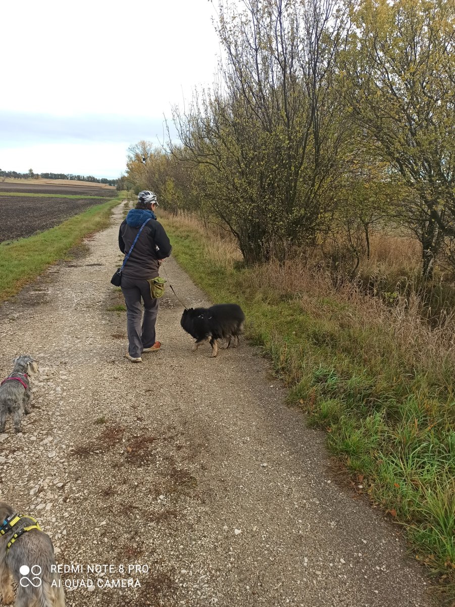 tam naložit ji,a jely jsme kousíček od ní a mezi polama jsme udělaly T trasu-od kapličky rovně,zabočit doleva,kousek jít,pak zpět,zpět Dafi valila,a valila dál,minula odbočku ke kapličce,takže jsme šly kousek za ní-když to brala tryskem😀