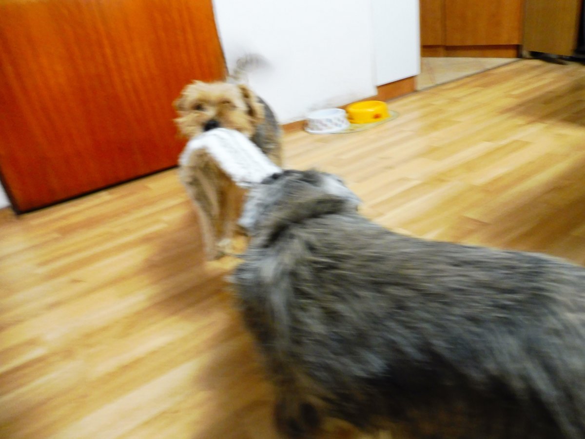 Dafi s hračkou,Žeryk s podomácku vyrobenou hračkou,poutka z popruhu a od trenek značky dedoles🙂aby poutko pružilo🙂